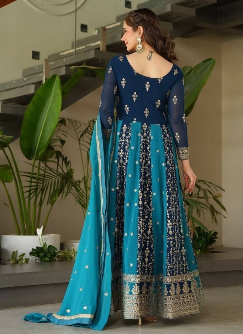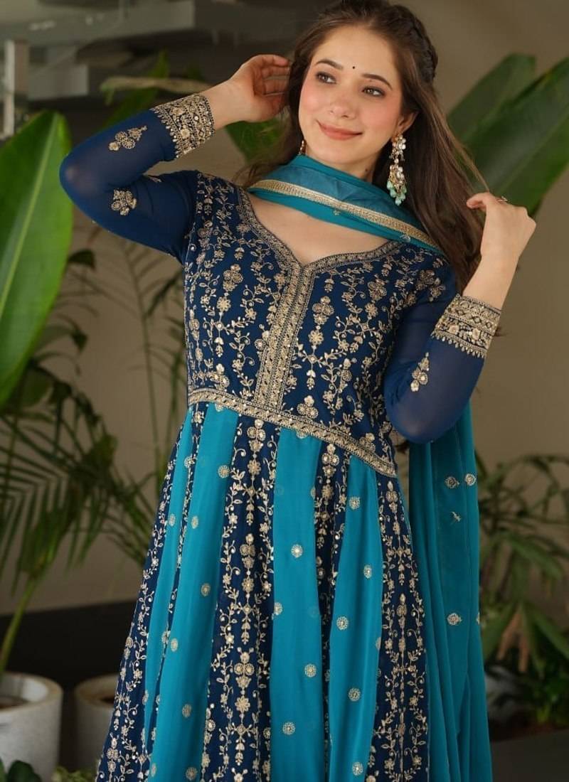 A Designer Blue Faux Blooming Anarkali Gown Paired With A 2.3 Meter Dupatta, Fully Lined With Cotton. Sequins And Zari Embroidery Adorn The 56 Inch Gown With 3 Meter Flare, Round Neck, And Pan Length Sleeves. Kali Stitch Detailing Adds Dimension To The Flowing Silhouette. The Dupatta Mirrors The Embroidery, Creating A Complete Ethnic Ensemble. Perfect For Weddings, Festive Events, And Cultural Occasions, This Set Blends Traditional Embroidery With Modern Faux Blooming Fabric For Effortless Drape.