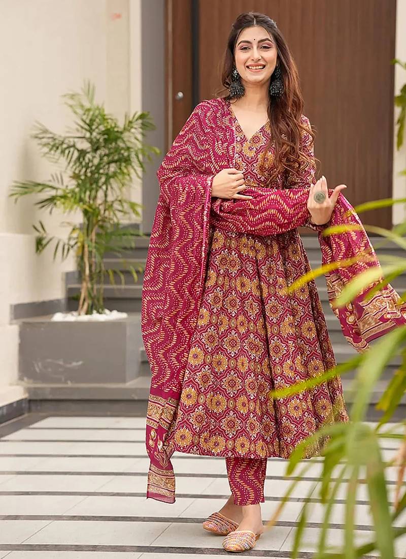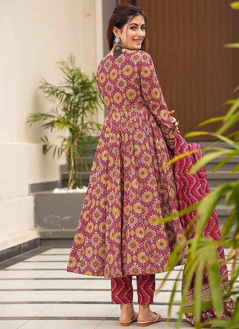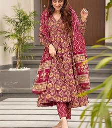 Burgundy digital printed muslin cotton stitched anarkali set with dupatta
