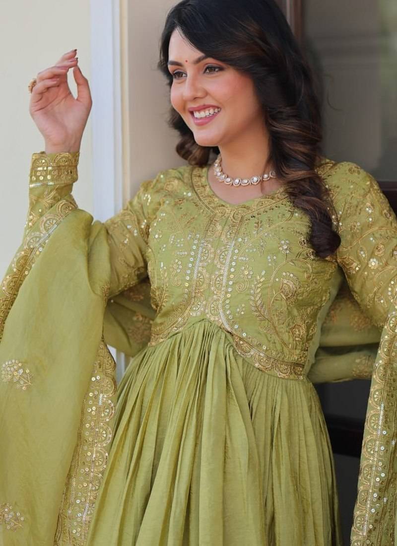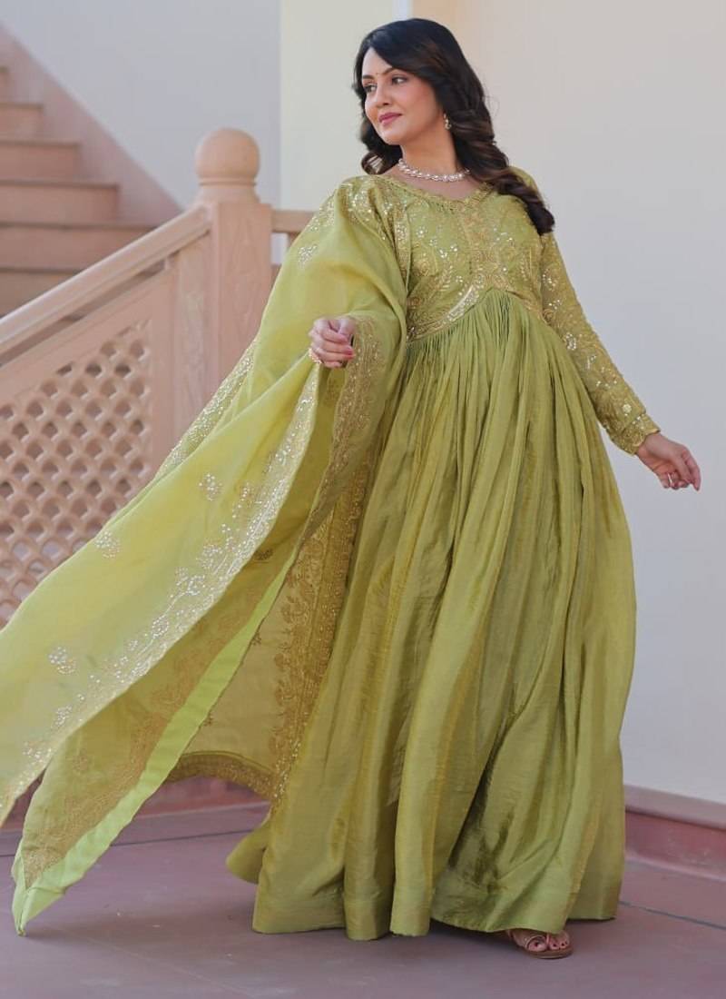 | Product Description | This Green Gold Crush Anarkali Gown Features Sequins And Multi Embroidery Over A Full Cotton Lining For Comfort. The 56 Inch A Line Gown With 3 Meter Flare Flows Gracefully, Enhanced By A Fancy Neck And Full Length Regular Sleeves. Stitch With Canvas Patta Ensures A Structured Fit, While The Matching 2.3 Meter Dupatta Mirrors The Embroidery For A Coordinated Look. Ideal For Weddings, Cultural Events, And Festive Gatherings, The Lightweight Gold Crush Fabric Highlights Intricate Embroidery While Maintaining Movement And Ease Of Wear. |