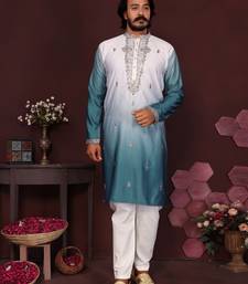 Men's teal cotton silk sequins embroidered kurta with pajama set
