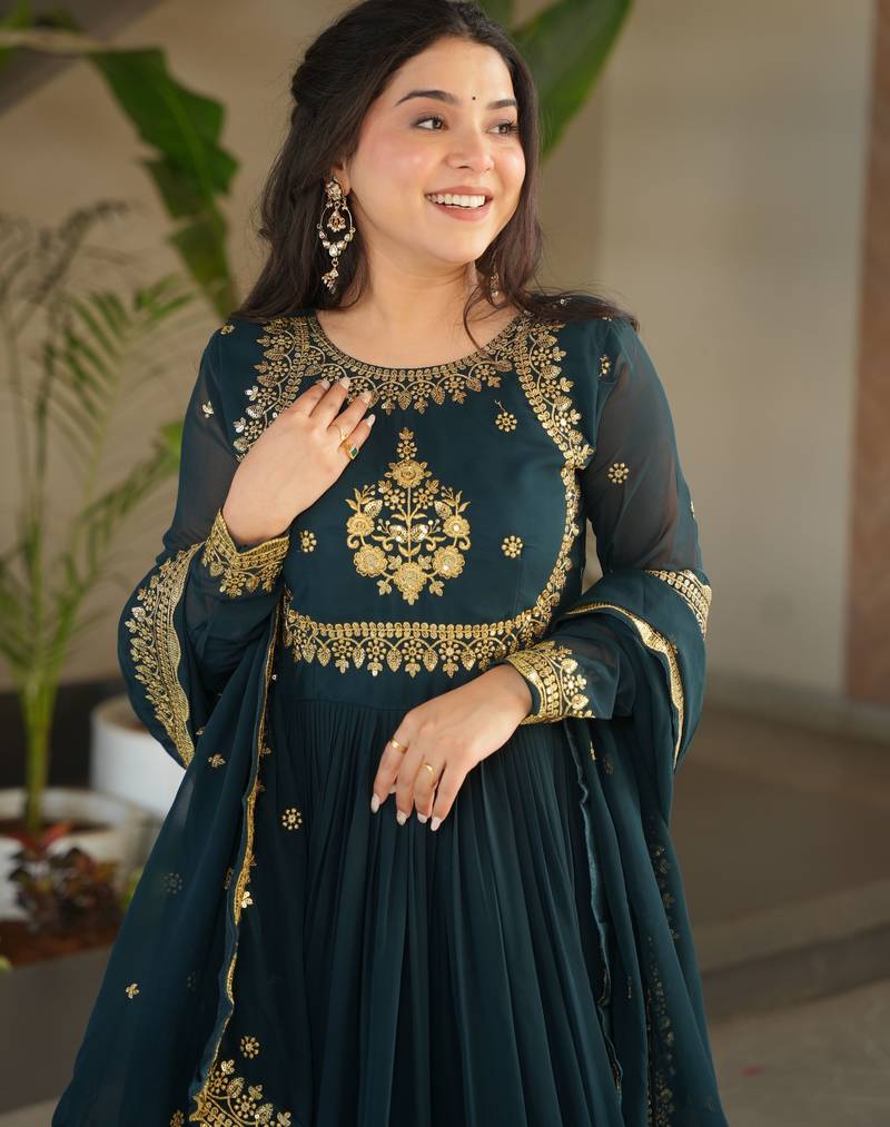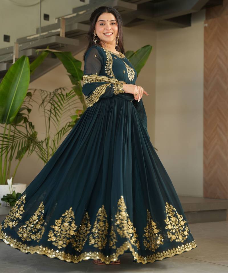 This Morpich A Line Kurta Is Made From Faux Georgette Fabric And Finished With Sequins And Zari Thread Embroidery Across The Body. The Design Includes A Round Neckline, Full Sleeves, And A Smooth Hem Without Slits. A Cotton Lining Supports The Embroidered Outer Fabric. The Kurta Is Paired With A Faux Blooming Dupatta That Complements The Texture And Tone Of The Outfit. The Package Includes One Stitched Kurta And One Dupatta With Coordinated Design Elements.