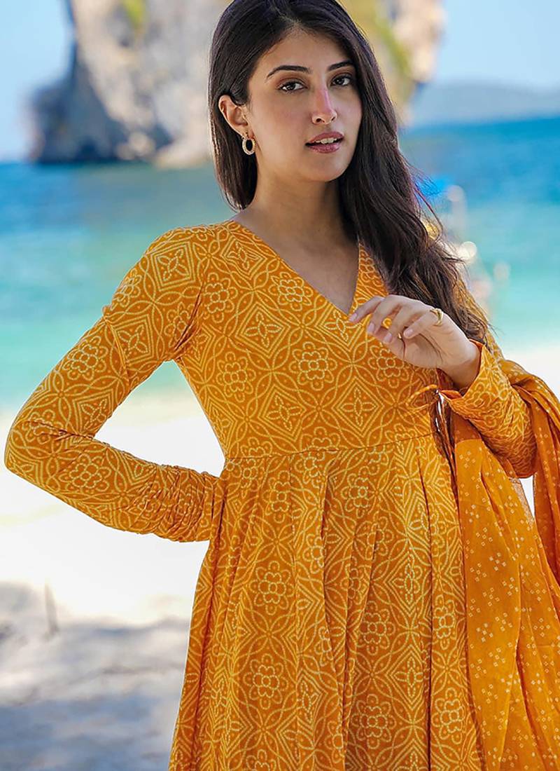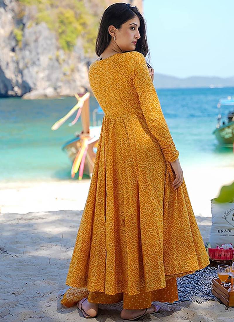 | Product Name | Mustard Yellow Digital Printed Muslin Cotton Stitched Anarkali Set With Dupatta | |