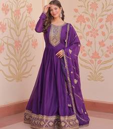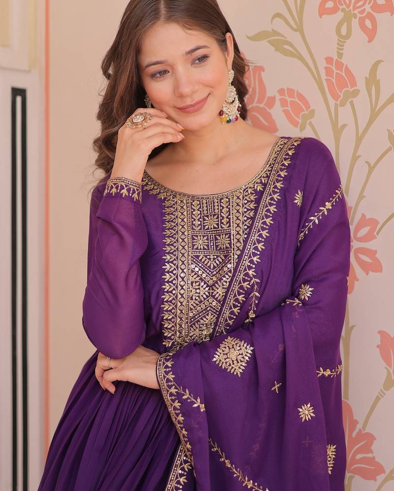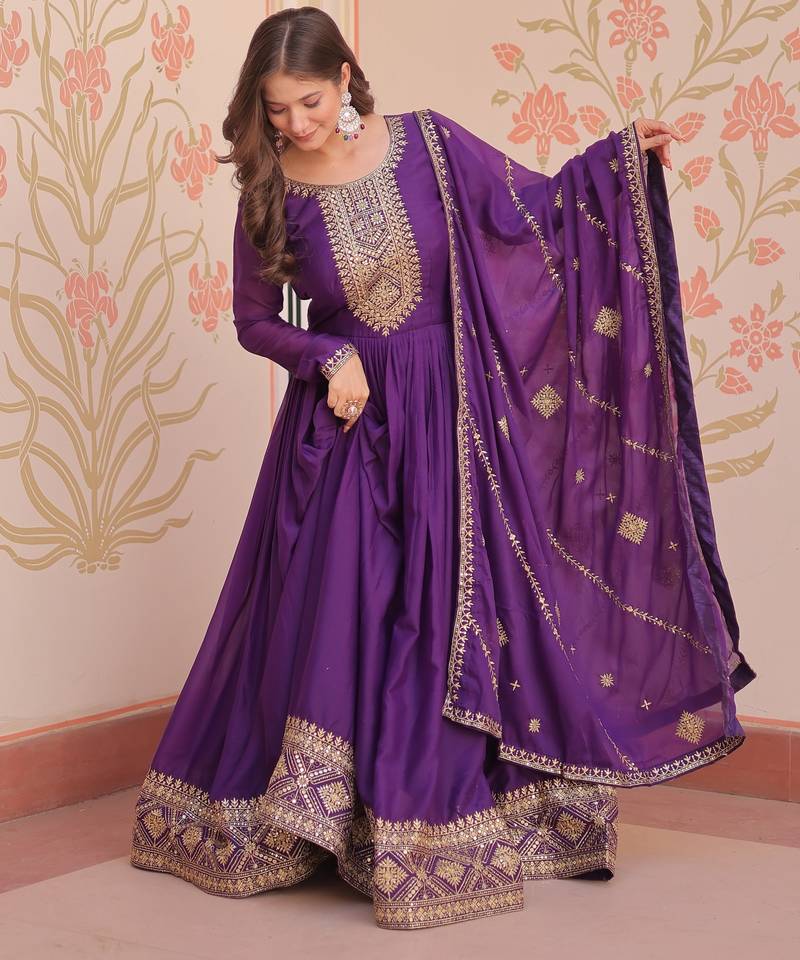 | Product Description | This Purple Star Georgette Anarkali Gown Features Sequins And Zari Embroidery Over A Full Cotton Lining. The 56 Inch A Line Gown With 3 Meter Flare Is Designed With A Round Neckline And Full Length Sleeves. The Coordinating 2.3 Meter Dupatta Is Adorned With Matching Sequins And Zari Embroidery, Finished With A Lace Border For A Complete Ethnic Ensemble. Ideal For Weddings, Festive Events, And Cultural Gatherings, This Set Combines Lightweight Star Georgette With Detailed Embroidery For Graceful Movement And Textured Elegance. |