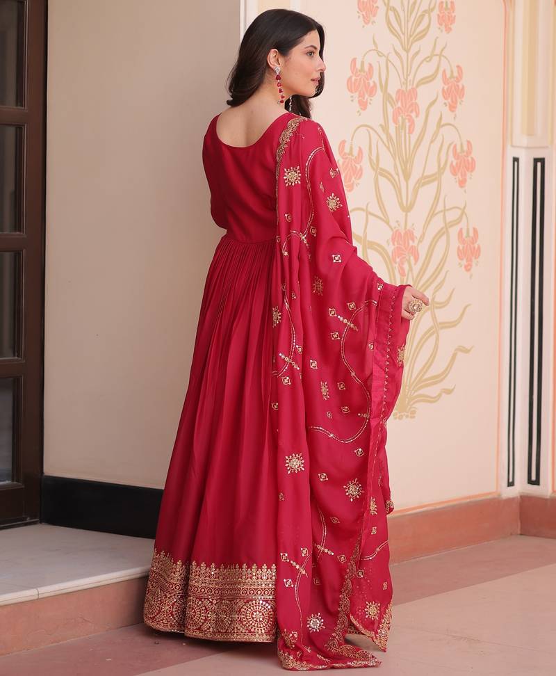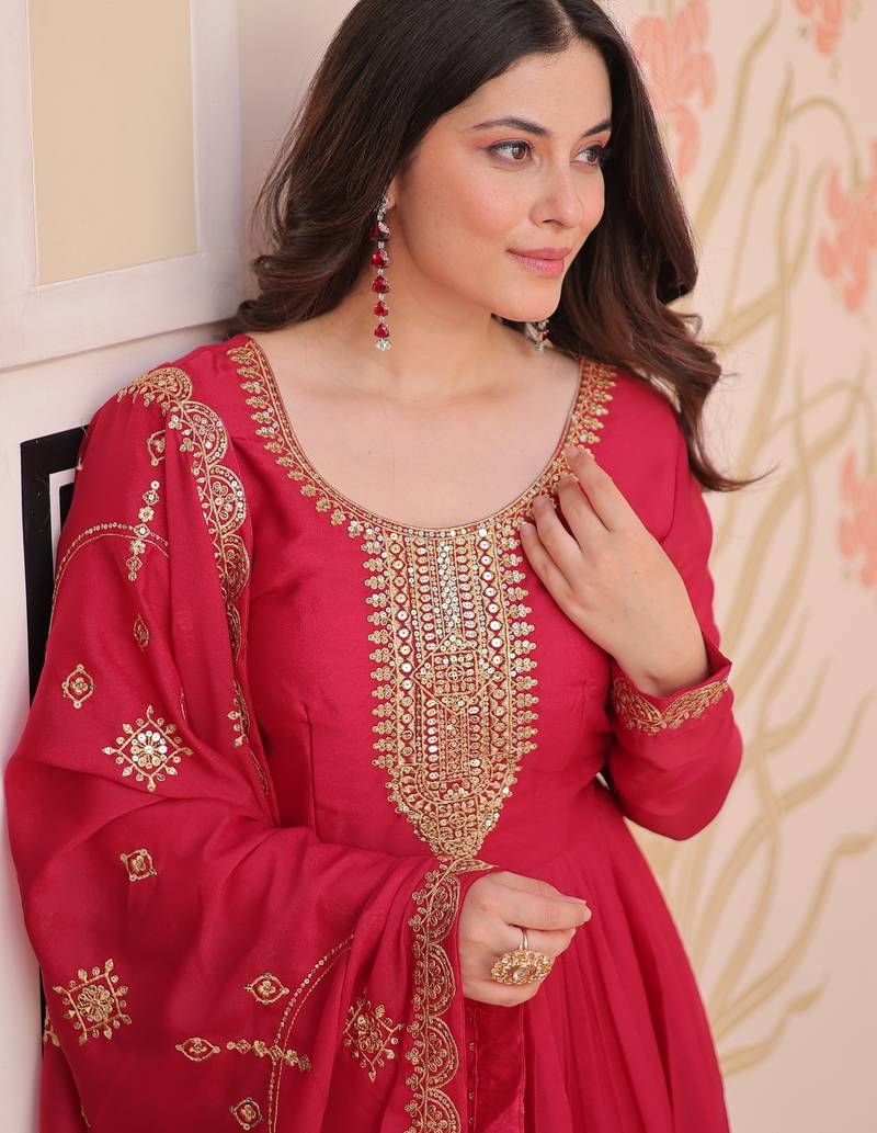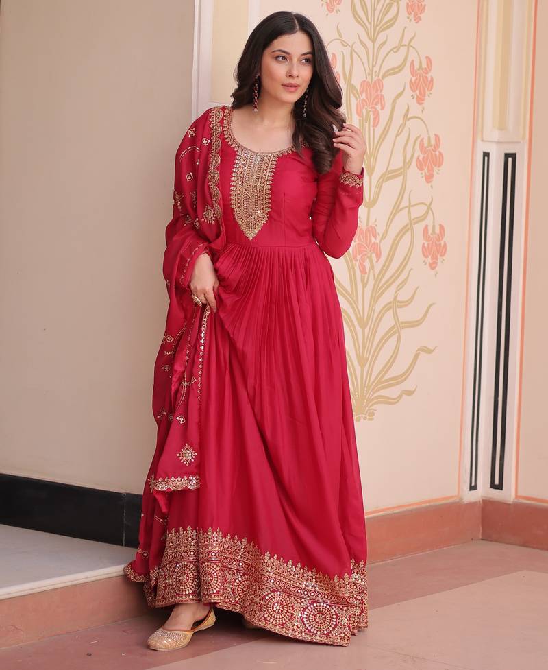 | Product Description | A Designer Rani Pink Star Georgette Anarkali Gown Paired With A 2.3 Meter Dupatta Featuring Sequins, Zari Embroidery, And Lace Border. Fully Lined With Cotton, The 56 Inch Gown Has A 3 Meter Flare, Round Neckline, And Full Sleeves. Sequins And Zari Embroidery Enhance The A Line Silhouette While The Dupatta Mirrors The Detailing For A Complete Ethnic Set. Suitable For Weddings, Festive Events, And Cultural Celebrations, This Gown Merges Lightweight Star Georgette Fabric With Artisan Embroidery For Flowing Elegance And Visual Appeal. |