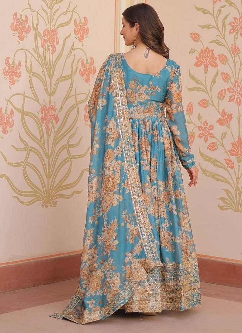 | Product Description | This Sky Blue Russian Silk Anarkali Features An A Line Silhouette With A Full Cotton Lining For A Soft, Flowing Fit. Digital Print With Sequins Embroidery Adorns The Bodice And Hem, While Full Sleeves And A Fancy Round Neck Offer A Modern Ethnic Appeal. The Matching Dupatta, Crafted In Russian Silk With Complementary Embroidery, Completes The Designer Look. Perfect For Festive Gatherings, Weddings, And Receptions, This Embroidered Anarkali Combines Rich Silk Texture With Contemporary Print Work, Giving Women A Stylish And Comfortable Ethnic Outfit. |