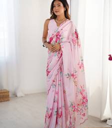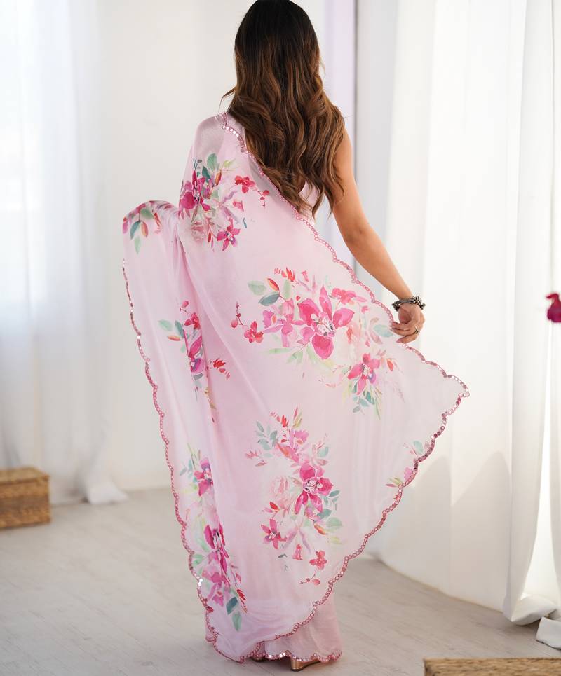 Women's baby pink chinon digital printed designer saree with blouse