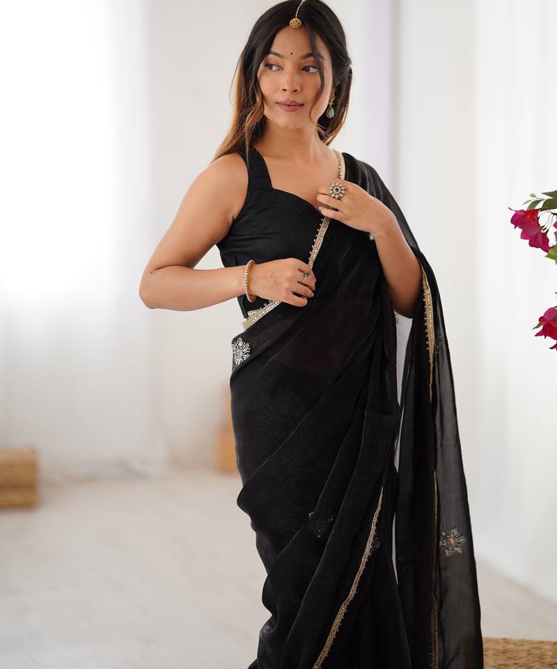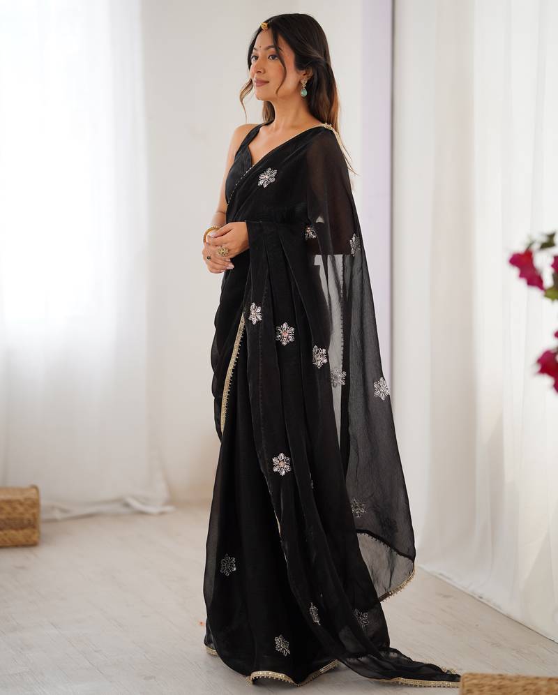 | Product Description | This Women’s Black Soft Fendy Designer Saree Is Styled With Delicate Embroidered Motifs Placed Evenly Across The Drape. The Fabric Has A Smooth, Lightweight Feel, Allowing The Saree To Fall Naturally And Create A Clean, Graceful Outline. The Subtle Border Along The Edges Adds A Neat Finish Without Overpowering The Look. The Embroidery Is Done In A Calm, Balanced Way, Giving The Saree A Refined Appearance Suitable For Women Who Prefer A Simple Yet Well Detailed Style. The Matching Blouse Comes In The Same Shade Of Black, Designed To Complement The Embroidery And The Overall Tone Of The Saree. This Set Works Well For Those Who Like Comfortable Drapes, Soft Fabrics, And A Design That Stays Elegant Without Looking Heavy. It Blends Understated Detailing With A Classic Black Color, Making It Easy To Carry And Style. |
