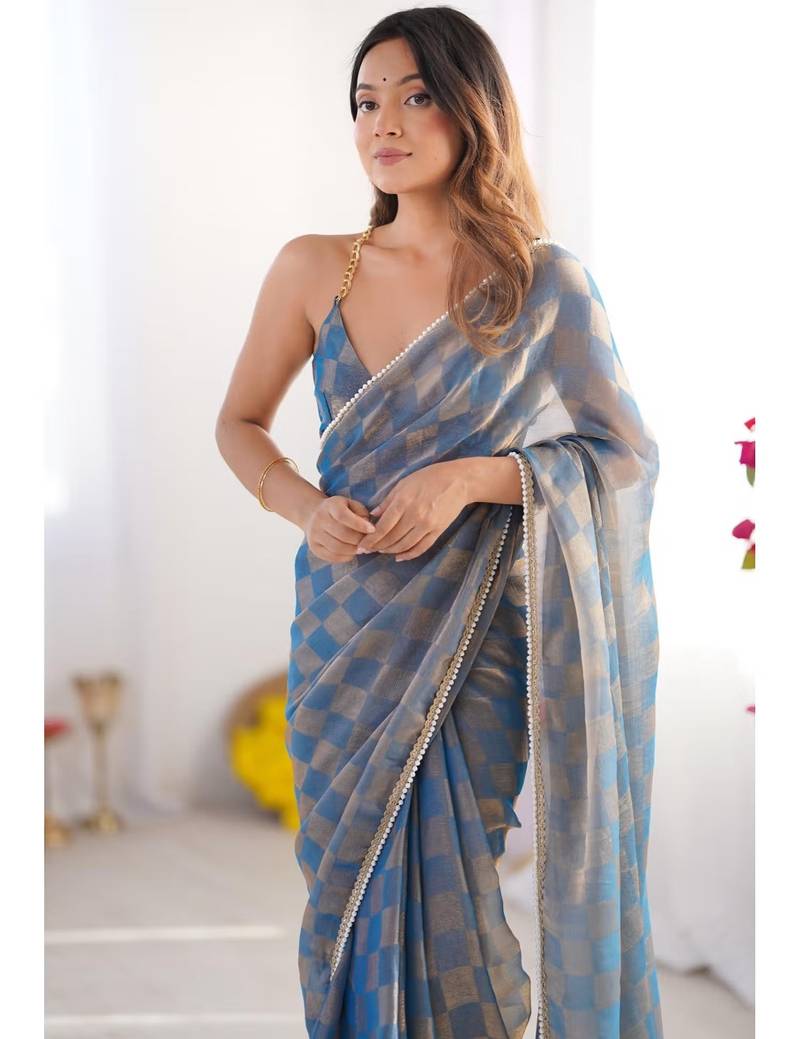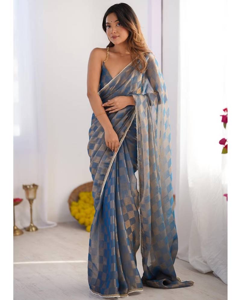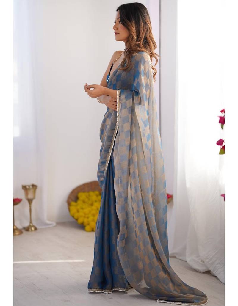 | Product Name | Blue Chiffon Designer Saree With Box Pattern And Moti Lace Border | |