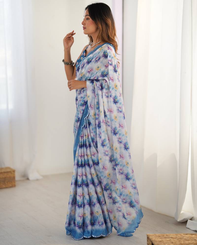 Women's blue chinon digital printed designer saree with blouse