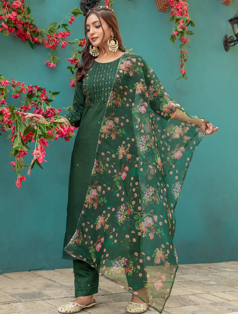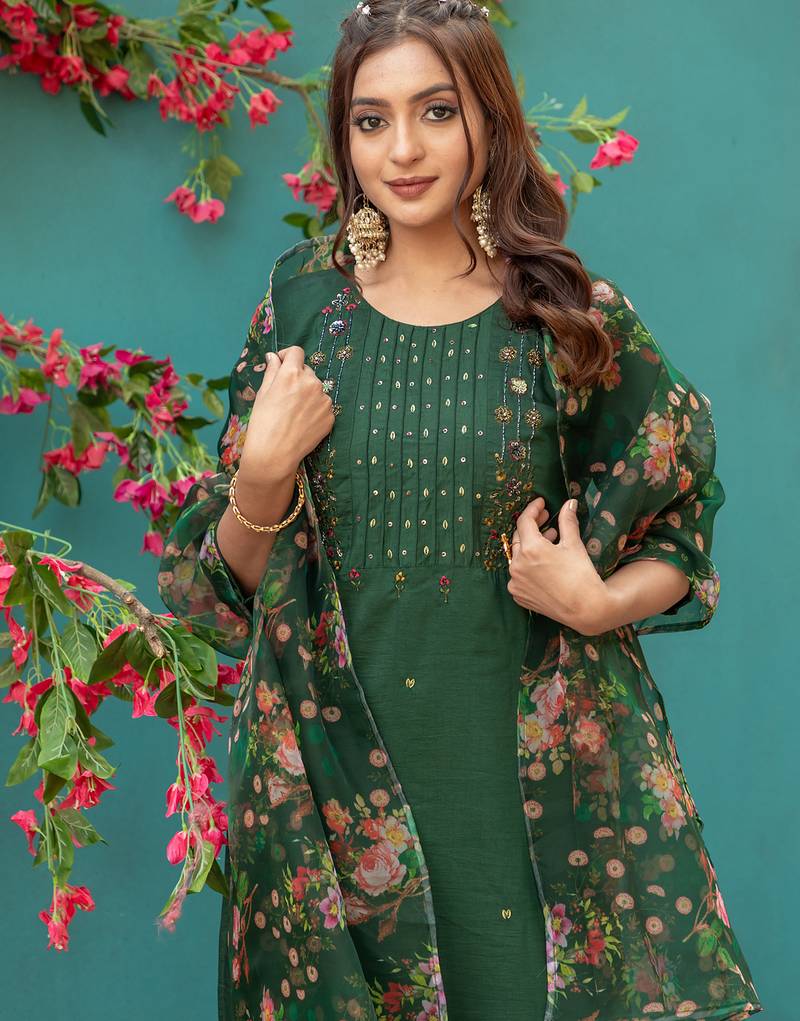Women's bottle green silk handwork designer kurta set with dupatta stitched