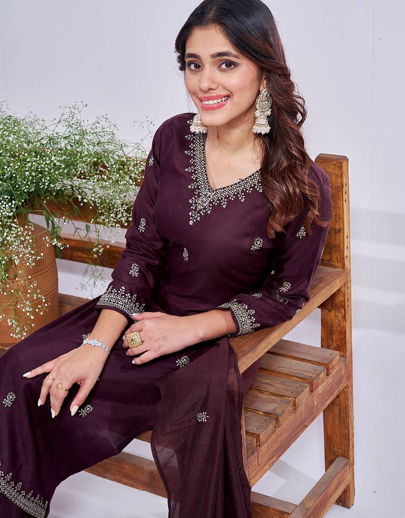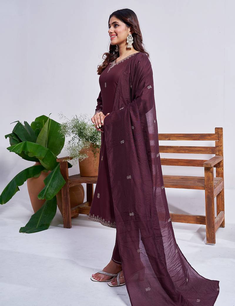 Women's coffee rayon embroidered designer kurta set with dupatta stitched
