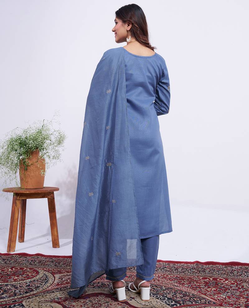 | Product Description | Straight Cut Blue Rayon Kurta With Intricate Embroidery, V Neck, Half Sleeves, And Side Slits. Ready To Wear Stitching Ensures A Structured Fit. Paired With Matching Rayon Pants For Comfort And Ease Of Movement. Includes A Silk Blend Dupatta To Complete The Ethnic Ensemble. Lightweight, Breathable Fabrics Offer Comfort While Maintaining A Classic Silhouette. Suitable For Traditional Gatherings, Casual Ethnic Wear, Or Festive Occasions, Providing A Coordinated Outfit In A Single Set. |