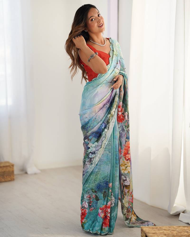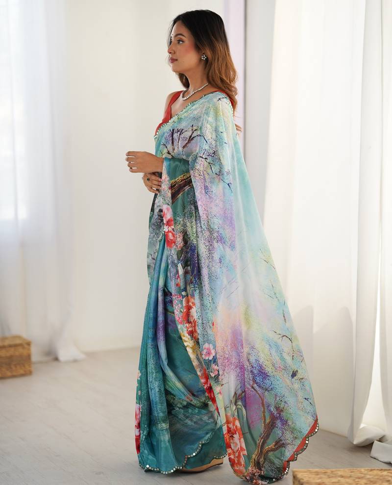 Women's multicolor chinon digital printed designer saree with blouse