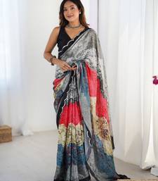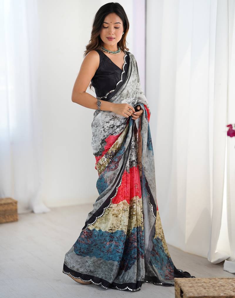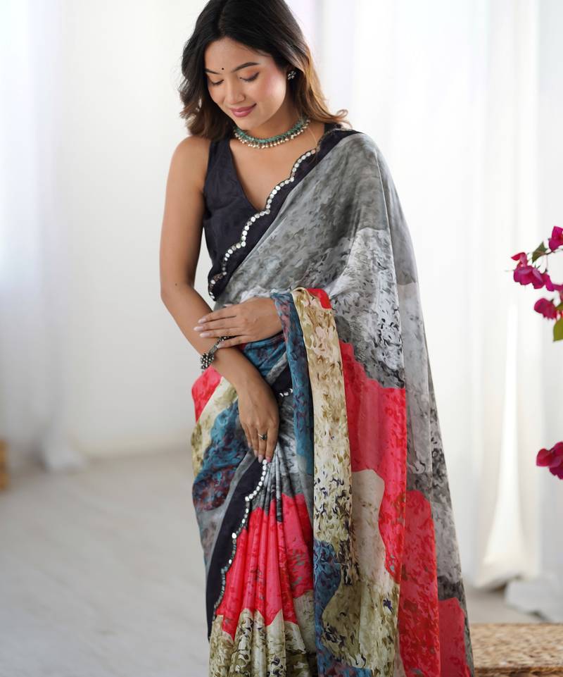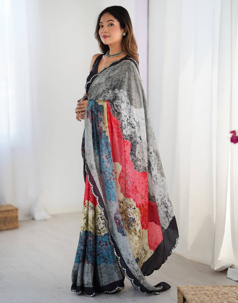 | Product Description | This Multicolor Chinon Saree Features A Smooth And Lightweight Texture That Drapes Naturally, Giving A Soft And Fluid Fall. The Fabric Showcases Digital Prints In A Mix Of Grey, Red, Blue, Beige, And Black, Arranged In Layered Strokes That Create A Textured, Artistic Look. The Variation Of Shades Gives The Saree Depth While Still Keeping It Easy On The Eyes. The Border Is Highlighted With A Scalloped Lace Outline, Adding A Neat Finish Without Taking Attention Away From The Print. Chinon Fabric Makes The Saree Comfortable To Wear Throughout The Day, Offering A Nice Blend Of Softness And Structure. Its Vibrant Yet Balanced Multicolor Pattern Makes It Suitable For Daytime Gatherings, Small Celebrations, Or Any Occasion Where A Modern Printed Saree Is Preferred. Matching Blouse Fabric Is Included, Allowing Flexible Styling. |