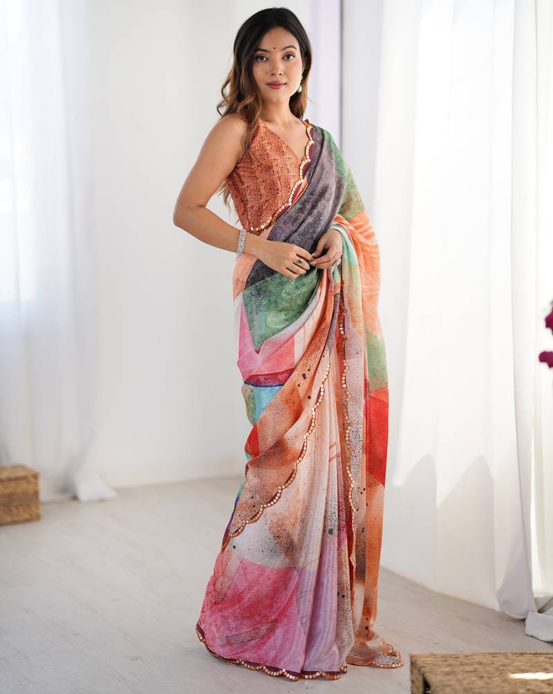 Digital printed multicolor soft chinon saree