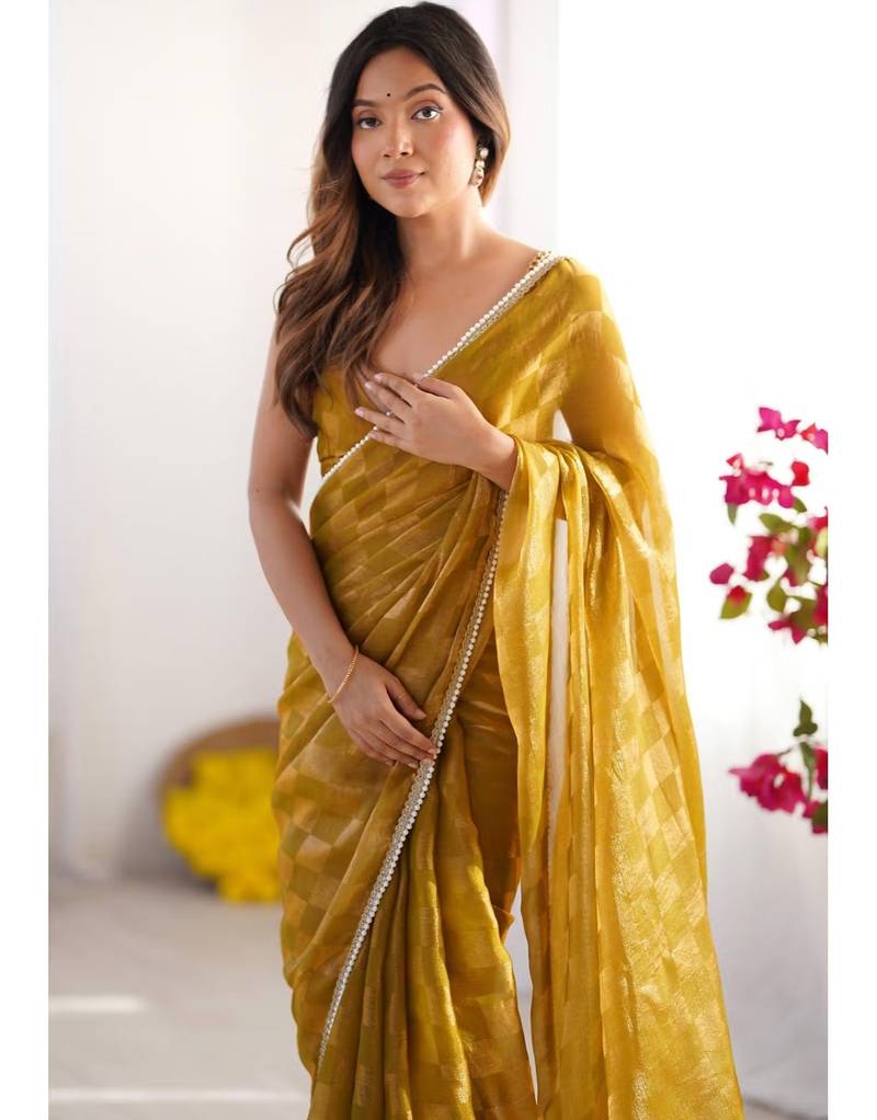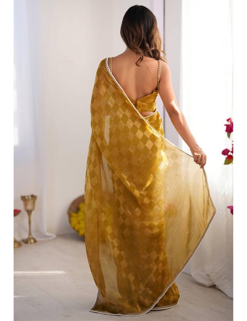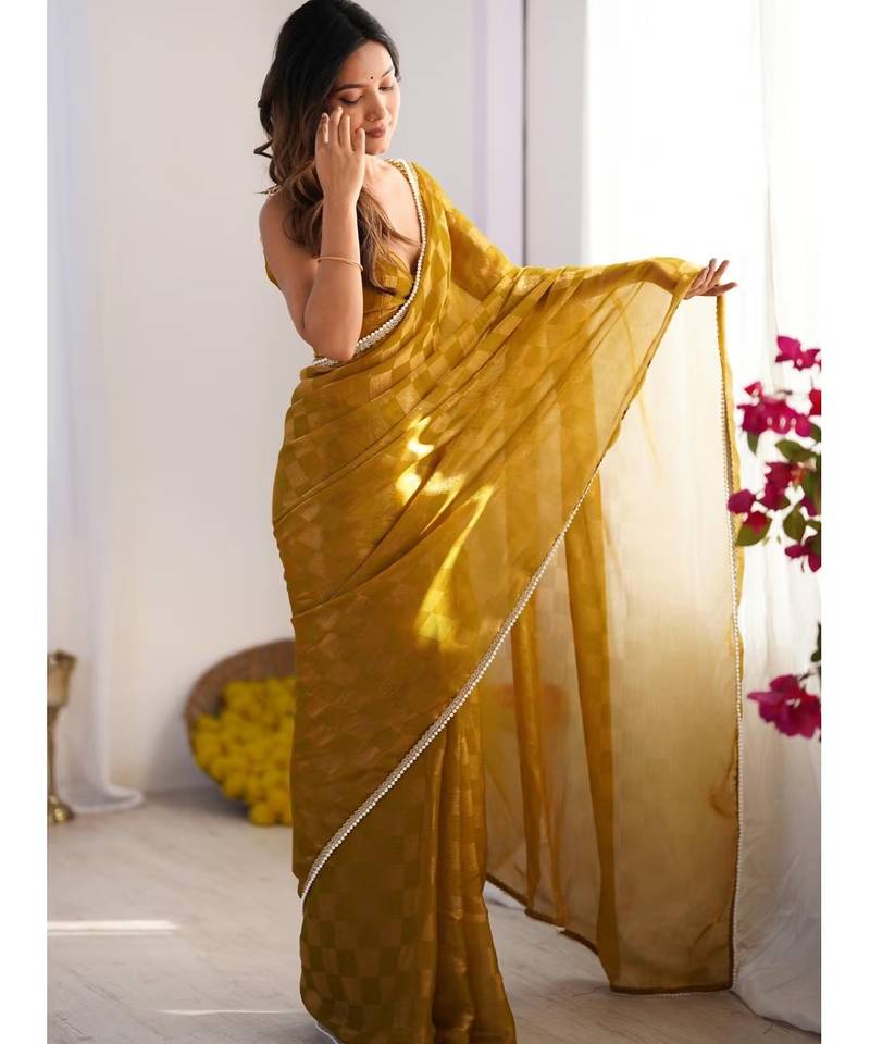 | Product Name | Mustard Chiffon Designer Saree With Box Pattern And Moti Lace Border | |