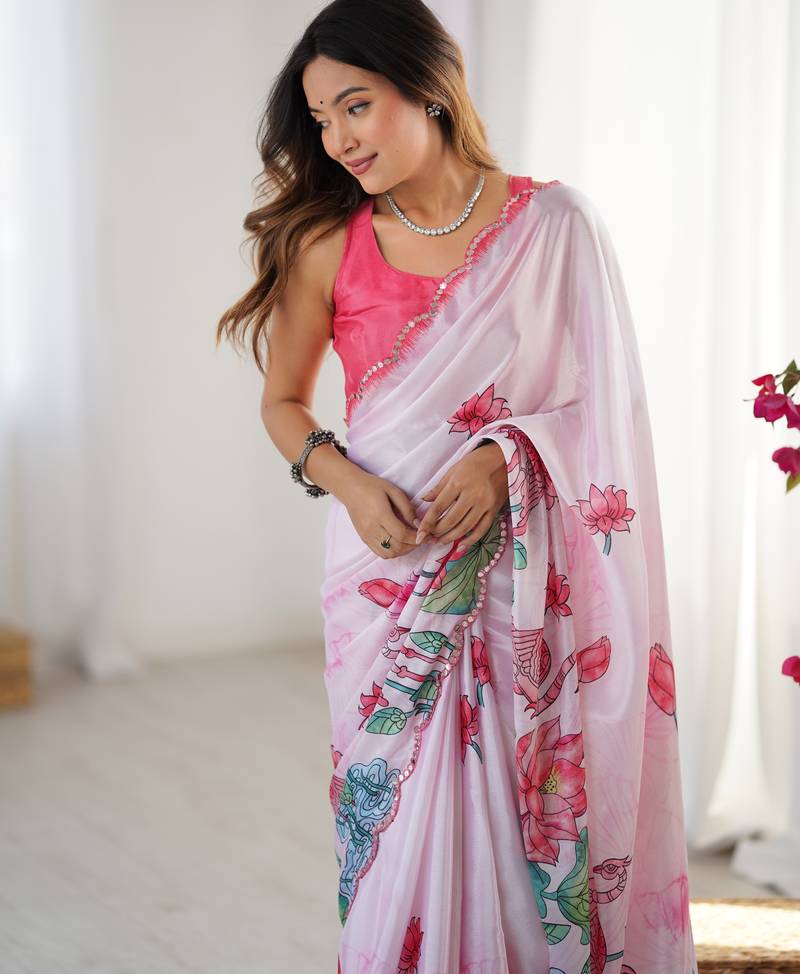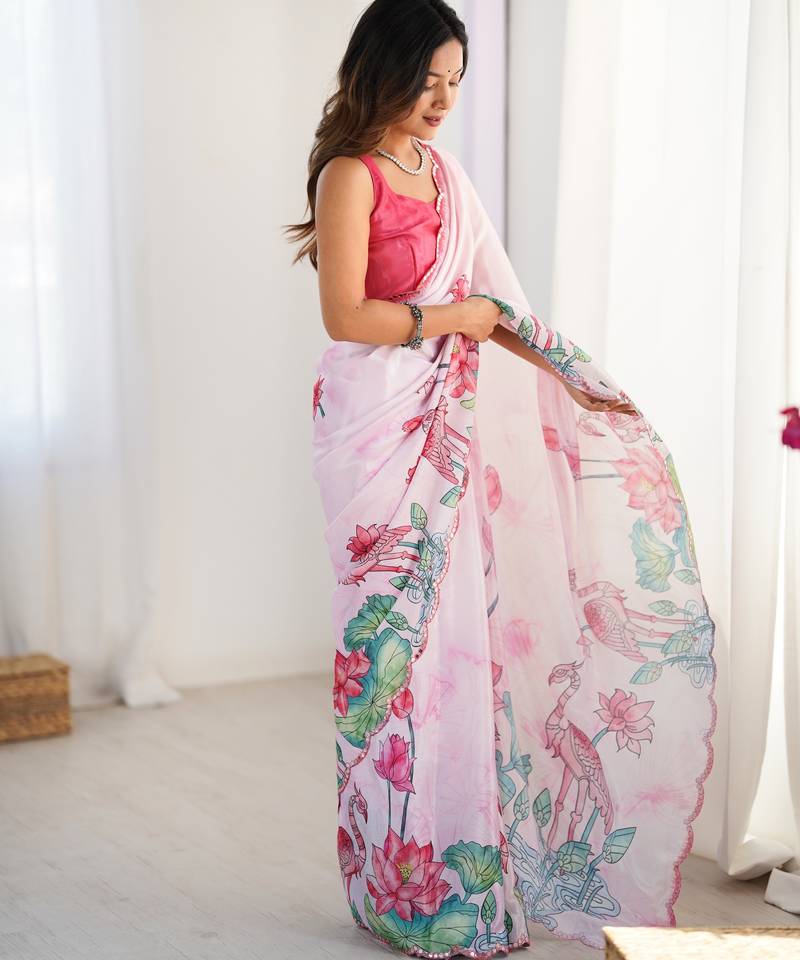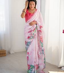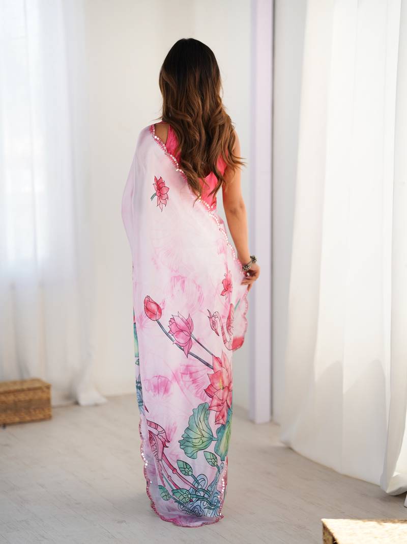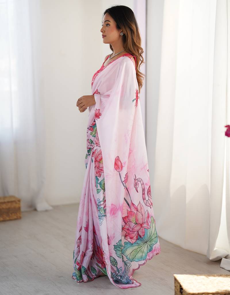 Women's pink chinon digital printed designer saree with blouse