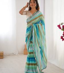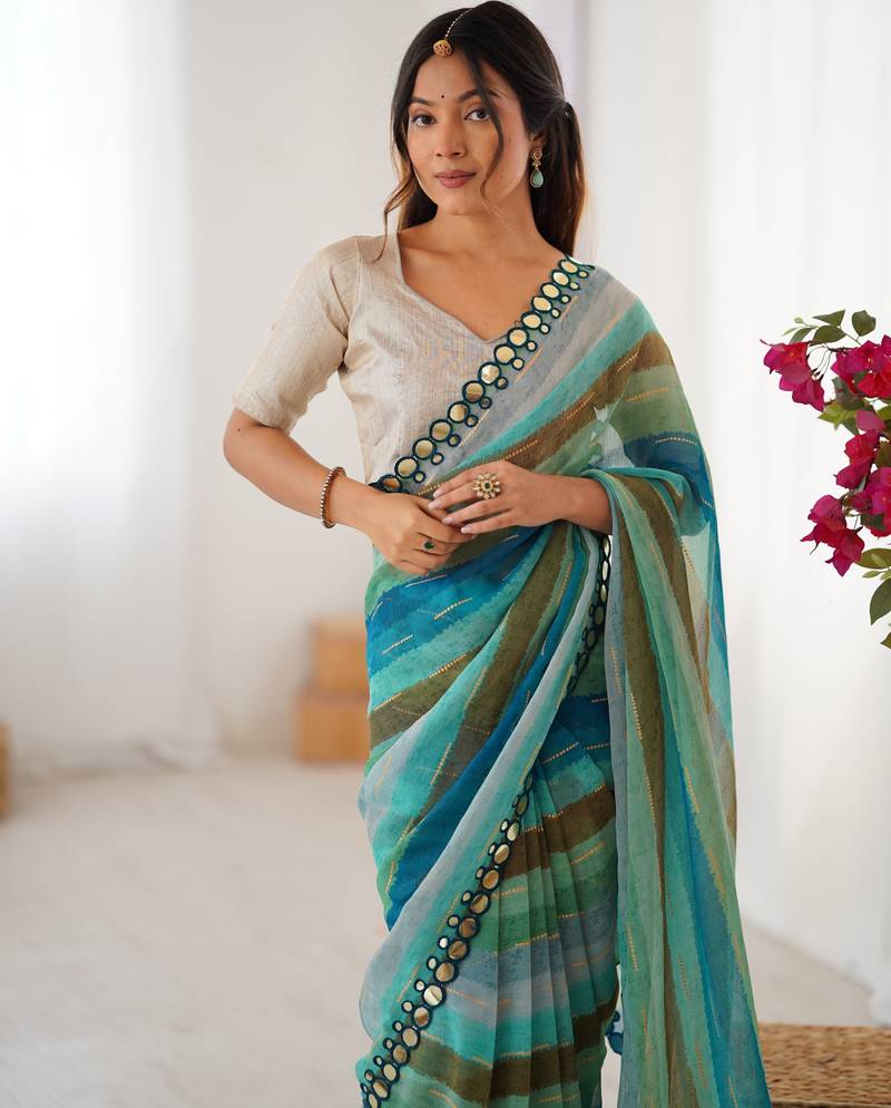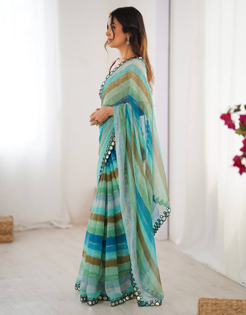 Sky blue chinon leriya zari printed saree with elegant border