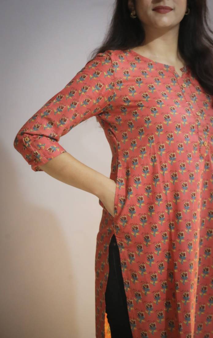 Women Cotton Hand Block Floral Printed Regular Straight Kurta. Which Is Accepted With Neat And Refined Printed Pattern ,Kurtis Has Kantha Embroidery With Sequins Highlighted On The Neck Yoke. This Attractive Kurti Will Surely Fetch Your Compliments For Your Rich Sense Style .Pair It With Churidaar And With Dupatta For The Complete Look.You Can Wear With Straight Pants And Jeans For Smart Look.Product Color May Slightly Vary Due To Photographic Lighting Sources .Model Is Wearing L Size And Her Size Is L. Impress Everyone With Your Stunning Traditional Look By Wearing This Beautiful Kurta Designed With Latest Designs.The Trendy Embroidery Work On The Front Yoke & Designs Speak A Language Of Elegance And Felinity, Using The Finest Quality Fabrics And Is Trendy Fashionable As Well As Comfortable.Our Choice Of Fits For Our Suit Catalogues Are Comfortable And Reliable, Making Sure You That You Can Choose The Right Fit Type To Suit Your Body And Imbibe The Perfect Look. Give You A Totally Traditional Look. Trendy Thread Embroidery On The Neck Line/Yoke. Kurta Has A Side Pocket For Added Convenience.