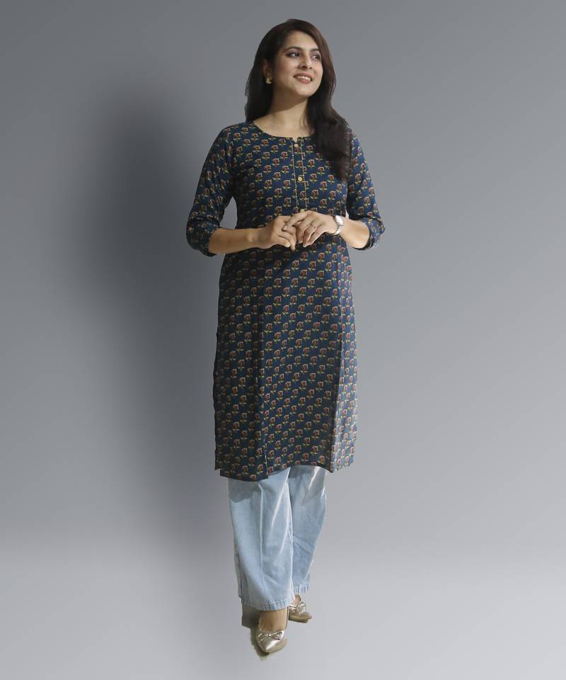 Women's cotton straight blue with multi color embellished kurta