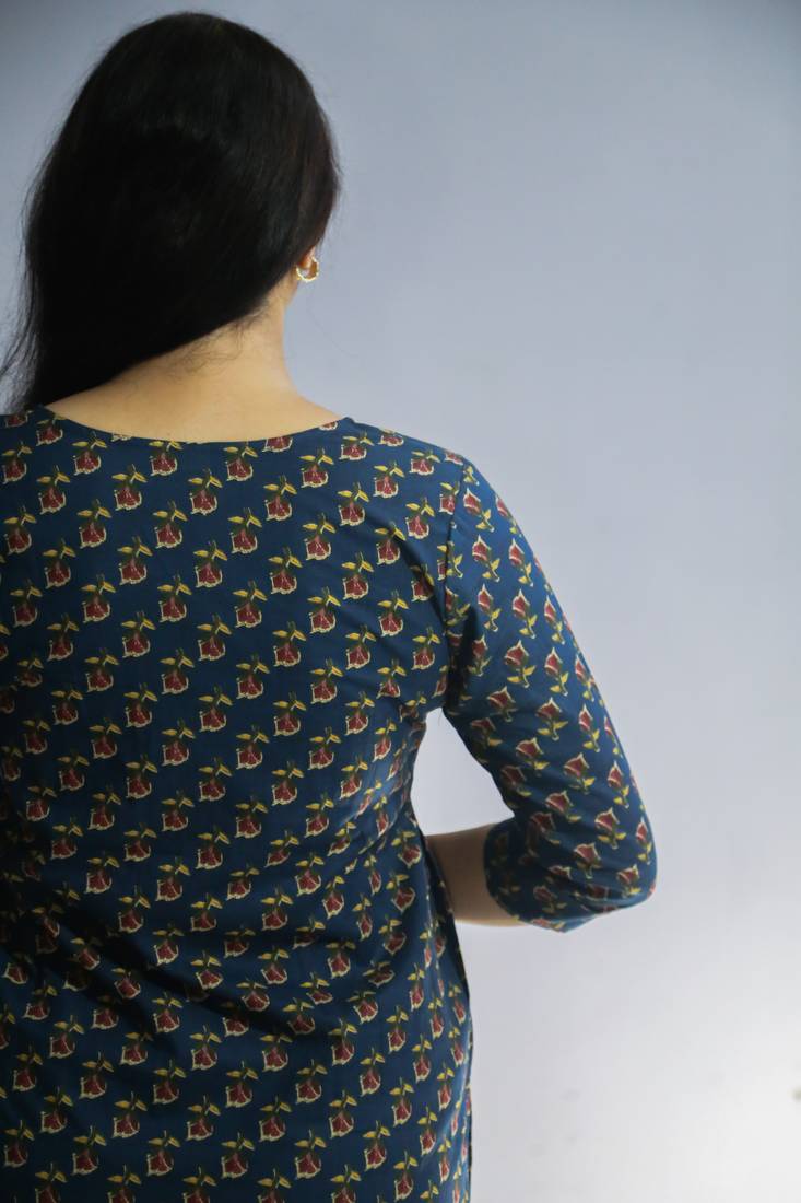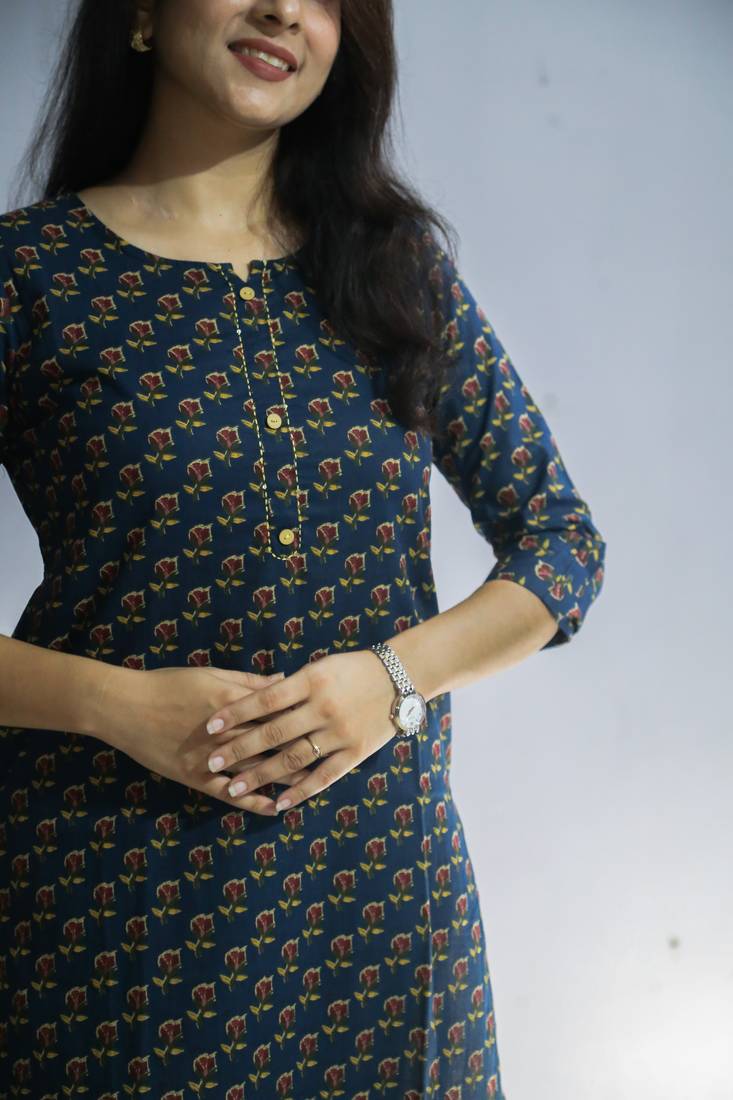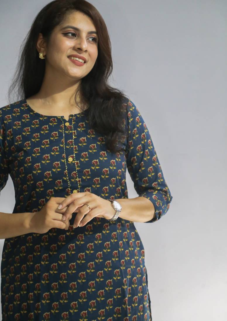 Women Cotton Hand Block Floral Printed Regular Straight Kurta. Which Is Accepted With Neat And Refined Printed Pattern ,Kurtis Has Kantha Embroidery With Sequins Highlighted On The Neck Yoke. This Attractive Kurti Will Surely Fetch Your Compliments For Your Rich Sense Style .Pair It With Churidaar And With Dupatta For The Complete Look.You Can Wear With Straight Pants And Jeans For Smart Look.Product Color May Slightly Vary Due To Photographic Lighting Sources .Model Is Wearing L Size And Her Size Is L. Impress Everyone With Your Stunning Traditional Look By Wearing This Beautiful Kurta Designed With Latest Designs.The Trendy Embroidery Work On The Front Yoke & Designs Speak A Language Of Elegance And Felinity, Using The Finest Quality Fabrics And Is Trendy Fashionable As Well As Comfortable.Our Choice Of Fits For Our Suit Catalogues Are Comfortable And Reliable, Making Sure You That You Can Choose The Right Fit Type To Suit Your Body And Imbibe The Perfect Look. Give You A Totally Traditional Look. Trendy Thread Embroidery On The Neck Line/Yoke. Kurta Has A Side Pocket For Added Convenience.