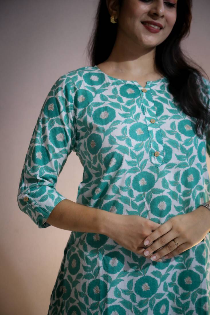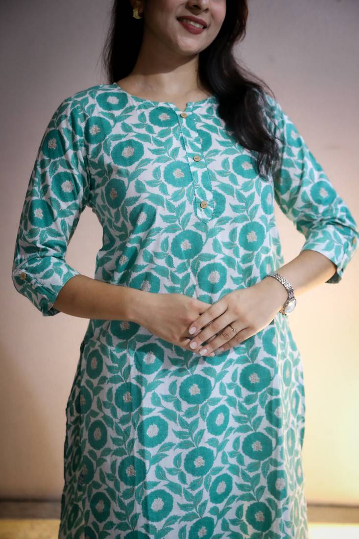 Women Cotton Hand Block Floral Printed Regular Straight Kurta. Which Is Accepted With Neat And Refined Printed Pattern ,Kurtis Has Kantha Embroidery With Sequins Highlighted On The Neck Yoke. This Attractive Kurti Will Surely Fetch Your Compliments For Your Rich Sense Style .Pair It With Churidaar And With Dupatta For The Complete Look.You Can Wear With Straight Pants And Jeans For Smart Look.Product Color May Slightly Vary Due To Photographic Lighting Sources .Model Is Wearing L Size And Her Size Is L. Impress Everyone With Your Stunning Traditional Look By Wearing This Beautiful Kurta Designed With Latest Designs.The Trendy Embroidery Work On The Front Yoke & Designs Speak A Language Of Elegance And Felinity, Using The Finest Quality Fabrics And Is Trendy Fashionable As Well As Comfortable.Our Choice Of Fits For Our Suit Catalogues Are Comfortable And Reliable, Making Sure You That You Can Choose The Right Fit Type To Suit Your Body And Imbibe The Perfect Look. Give You A Totally Traditional Look. Trendy Thread Embroidery On The Neck Line/Yoke. Kurta Has A Side Pocket For Added Convenience.