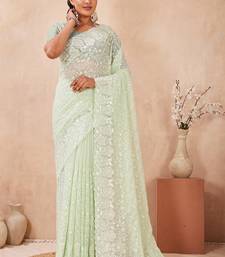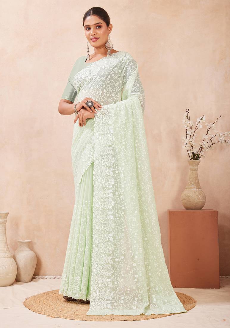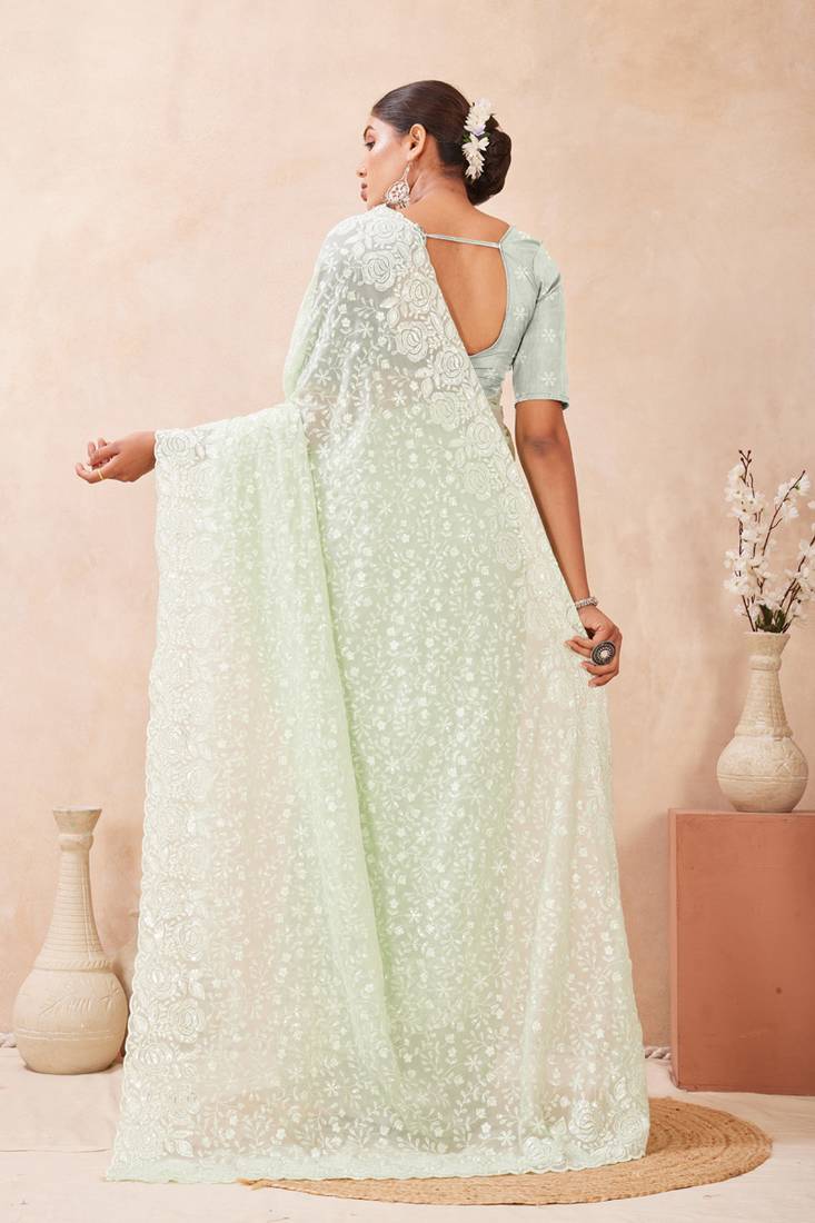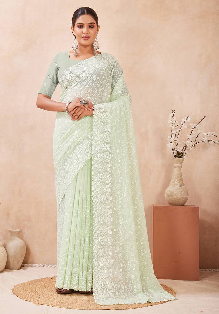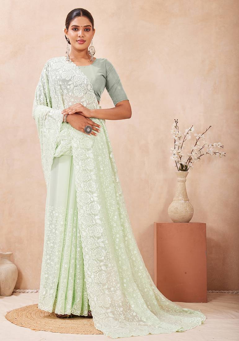 You Will Be Center Of Attraction In This Gorgeous Dusty Pista Classic Saree Beautifully Done With Heavy Resham & Sequins Embroidery Work Over The Attire To Make This Attire A Powerful Statement. This Saree Comes With Unstitched Dusty Pista Georgette Heavy Work Blouse Piece.The Size Of Saree Is 5.5 Meter And Blouse Size Is 0.80 Meter. Blouses With Elaborate Patterns And Colors Are Used For Photoshoot. Color And Pattern Of The Blouse Might Not Be As Shown In The Image. Designs, Color And Pattern On The Actual Product May Slightly Vary From Designs Shown In The Image. Images Are Only Representative.
