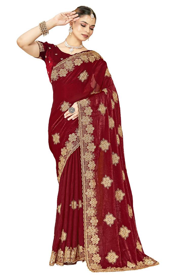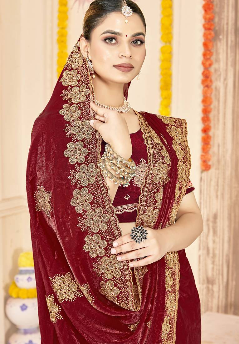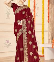 Designer maroon heavy zari embroidery silk blend party wear saree