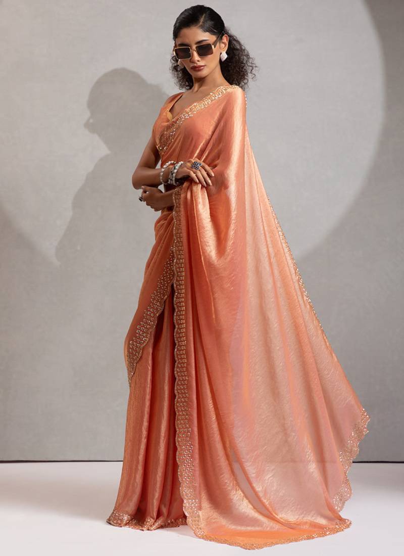 Designer peach handwork zarkan work silk blend saree