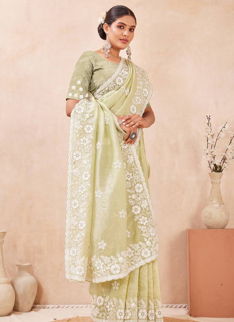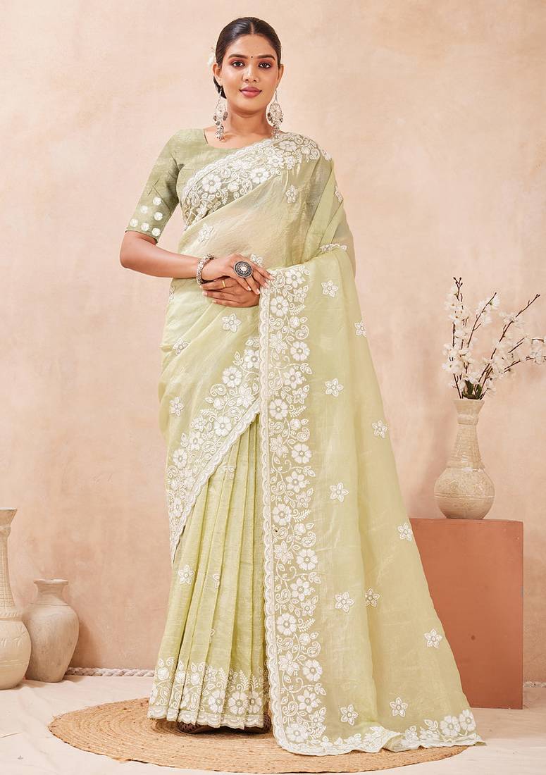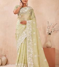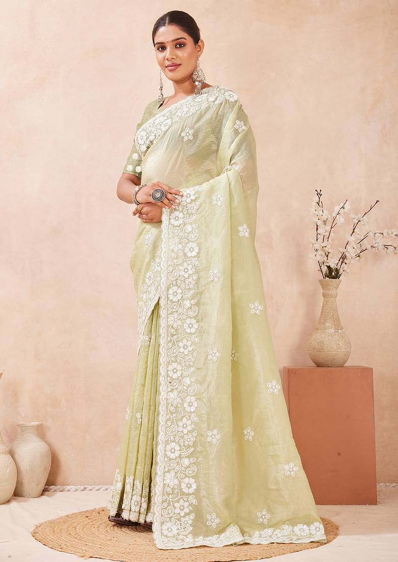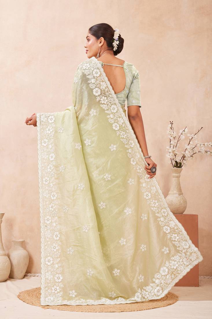 Indian dusty pista resham sequins embroidery work silk blend saree