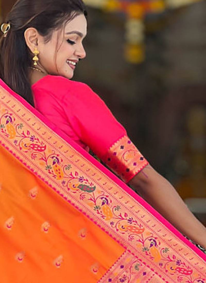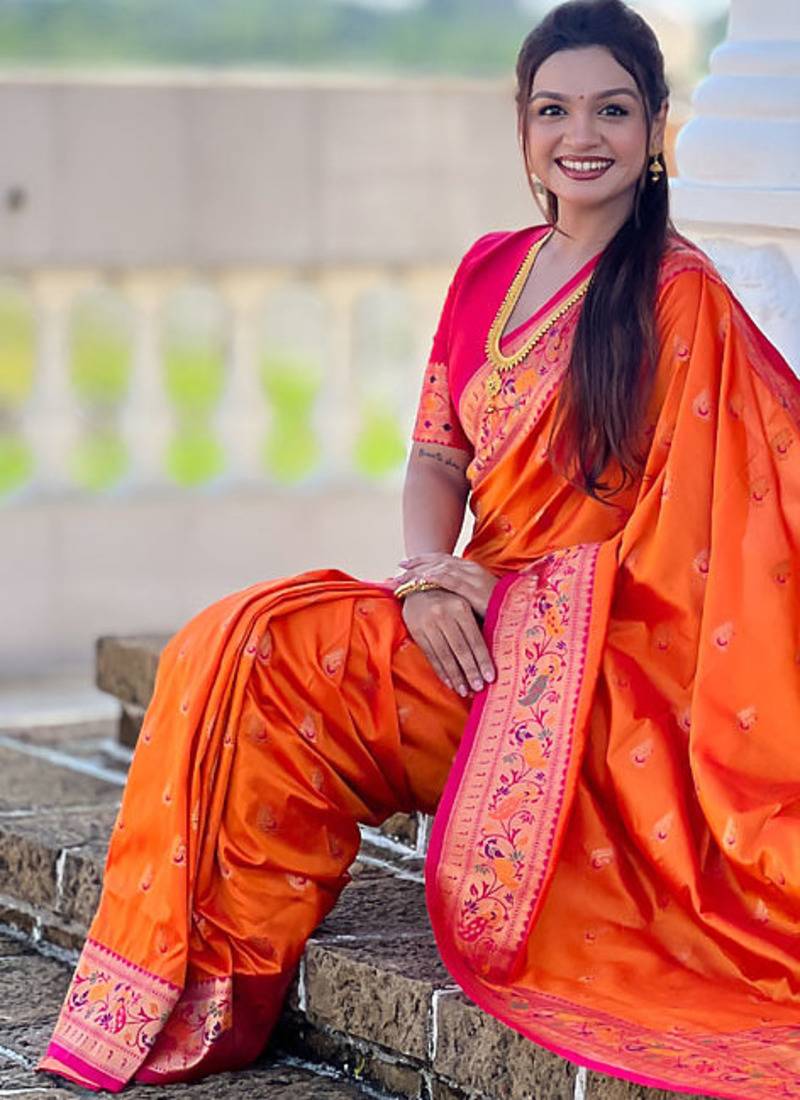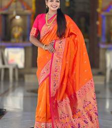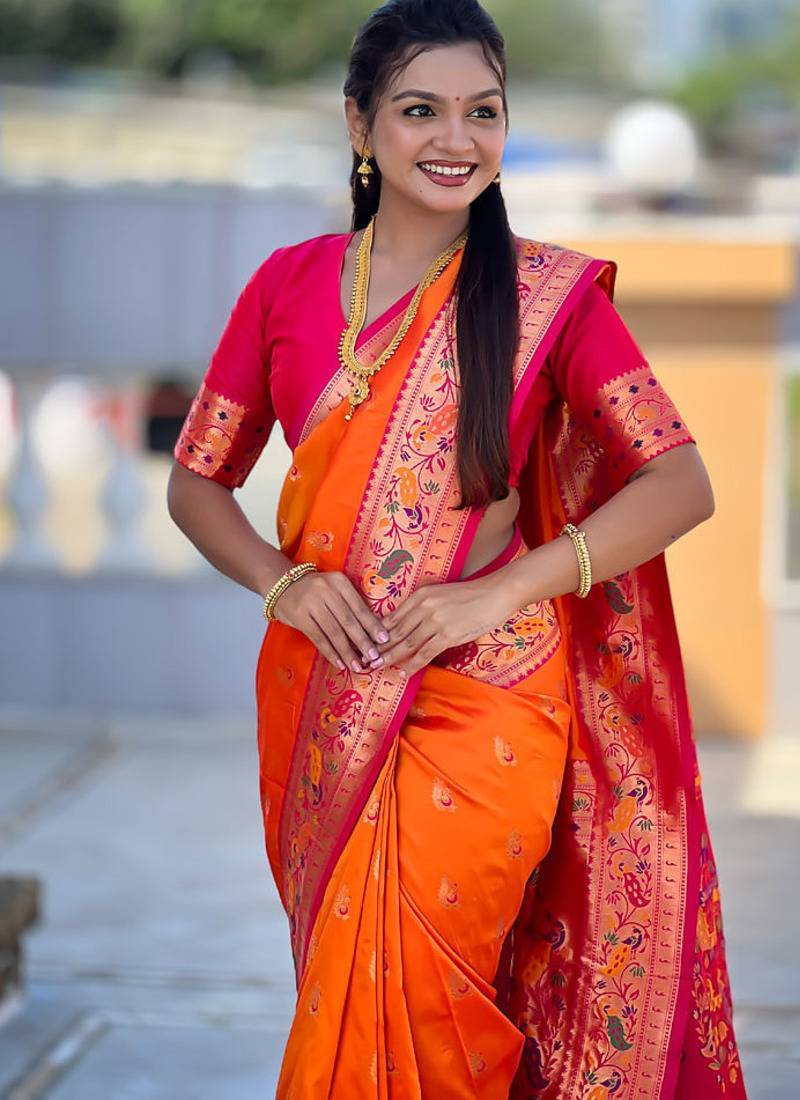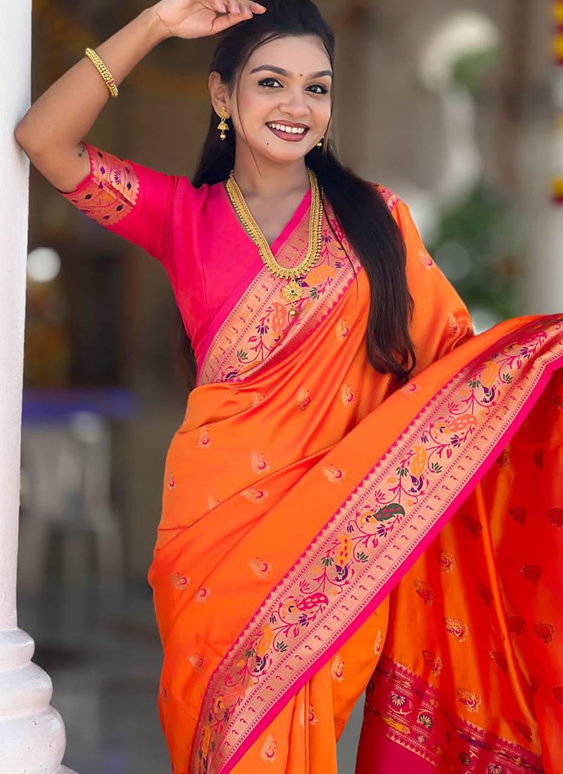 | Product Name | Indian Orange Zari Motif Weaving Work Paithani Silk Saree | |