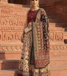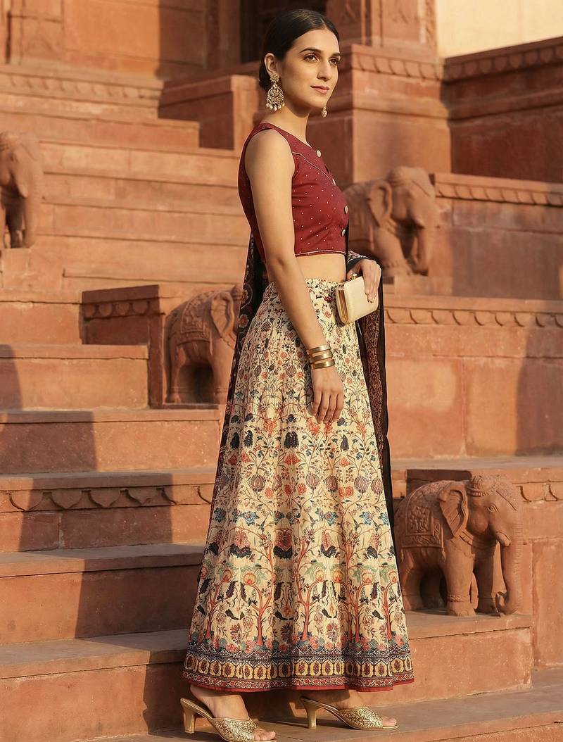 | Product Description | This Lehenga Choli Set Includes A Circular Satin Lehenga In Cream Color With Kalamkari Printed Detailing. The Lehenga Is Paired With An Unstitched Raw Silk Blouse In Matching Maroon, Designed With Embroidery Work And Featuring A Quarter Sleeve And V Neck Style. The Set Is Completed With A Multicolor Silk Dupatta Detailed With Thread Work. A Cotton Lining Is Included For Structure And Comfort. |
