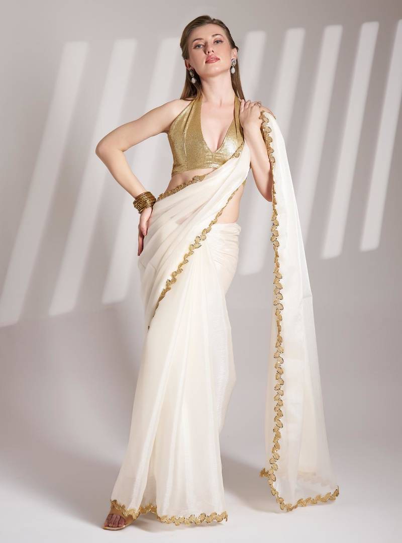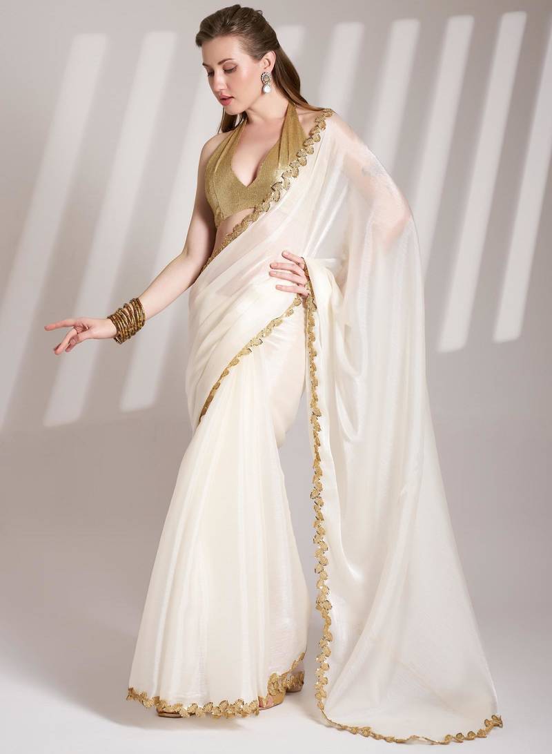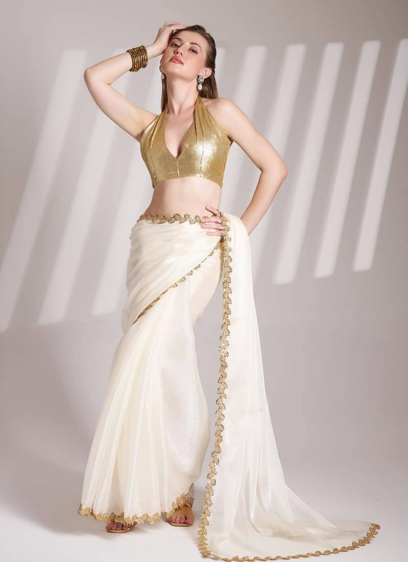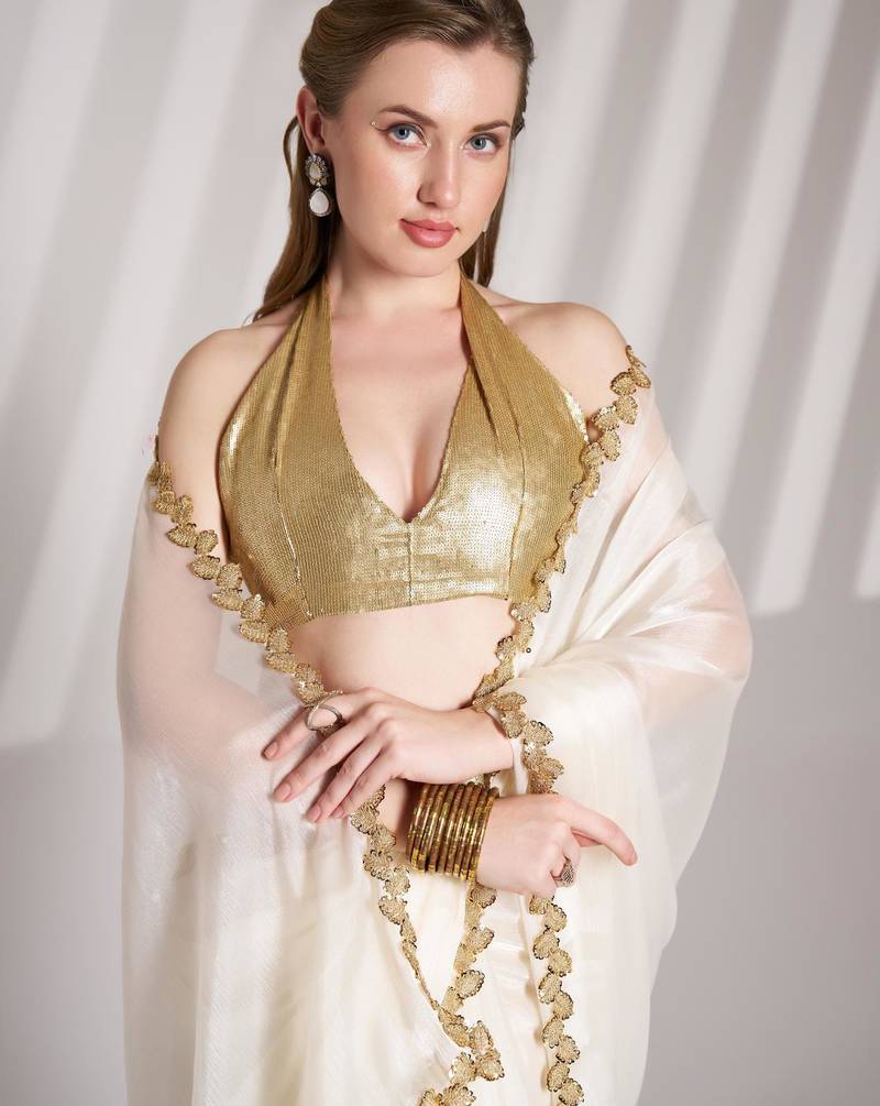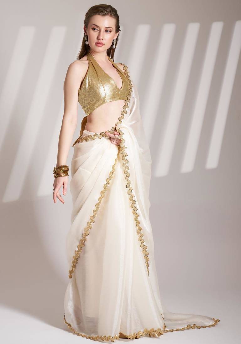 Off white embellished sequinned organza saree with blouse