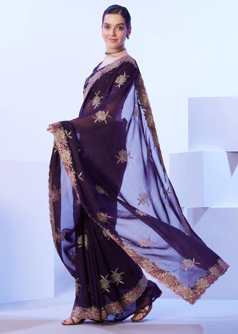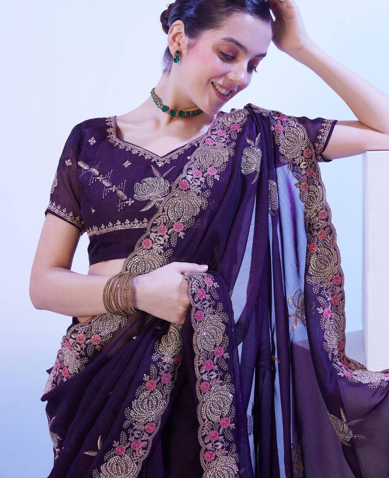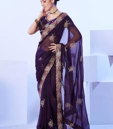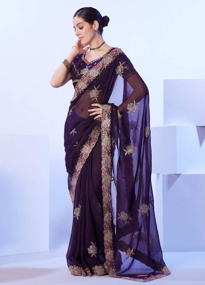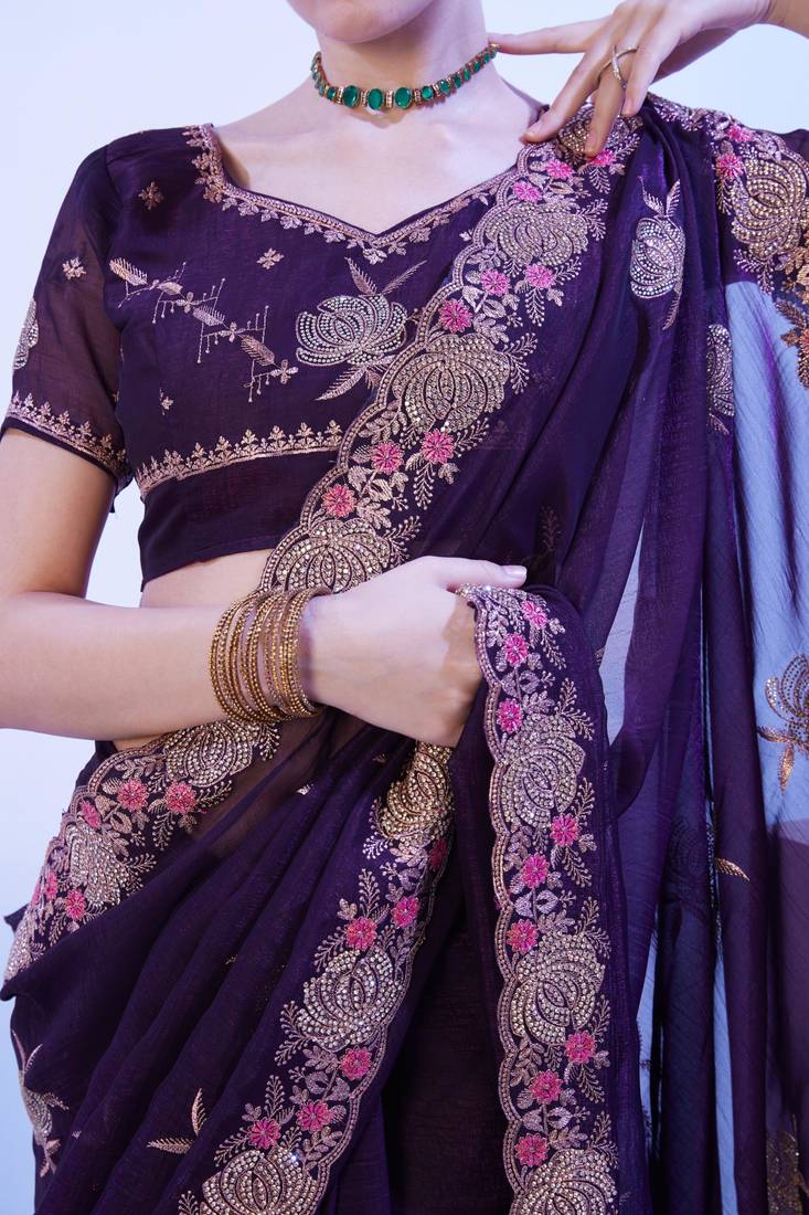 Wine embellished chiffon saree with blouse