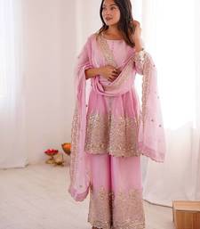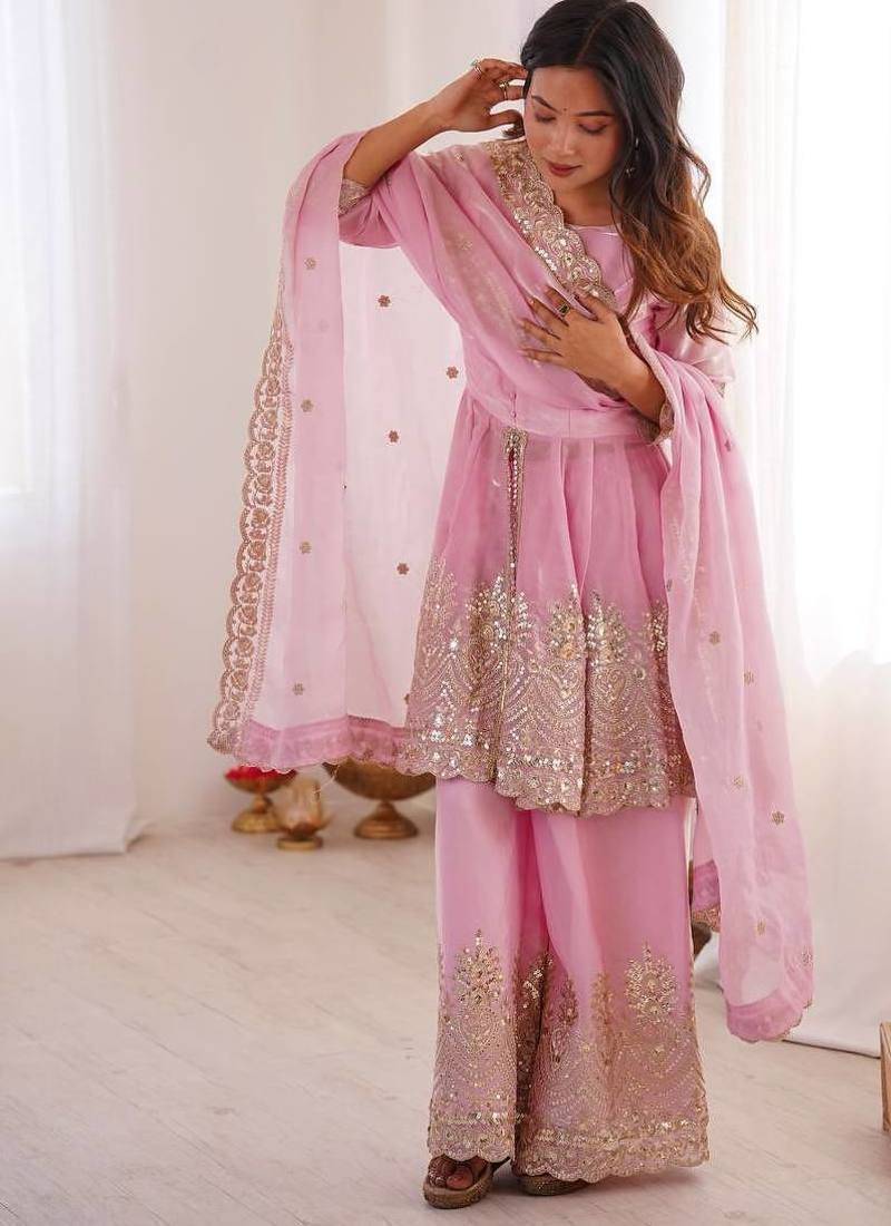 | Product Name | Baby Pink Two Tone Fandy Silk Heavy Embroidery Sequins & Mirror Work Fully Stitched Kurti Palazzo Set | |