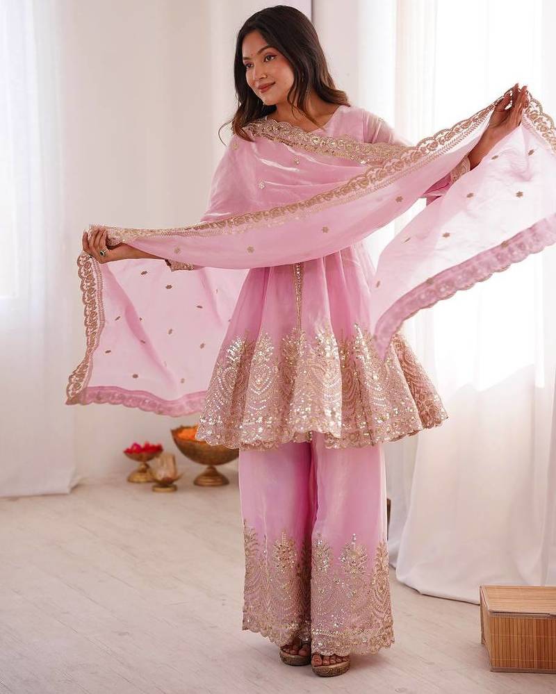 Baby pink two tone fandy silk heavy embroidery sequins & mirror work fully stitched kurti palazzo set