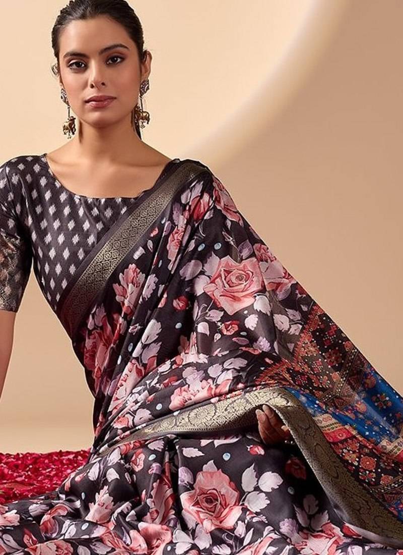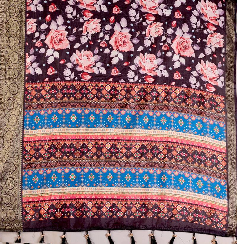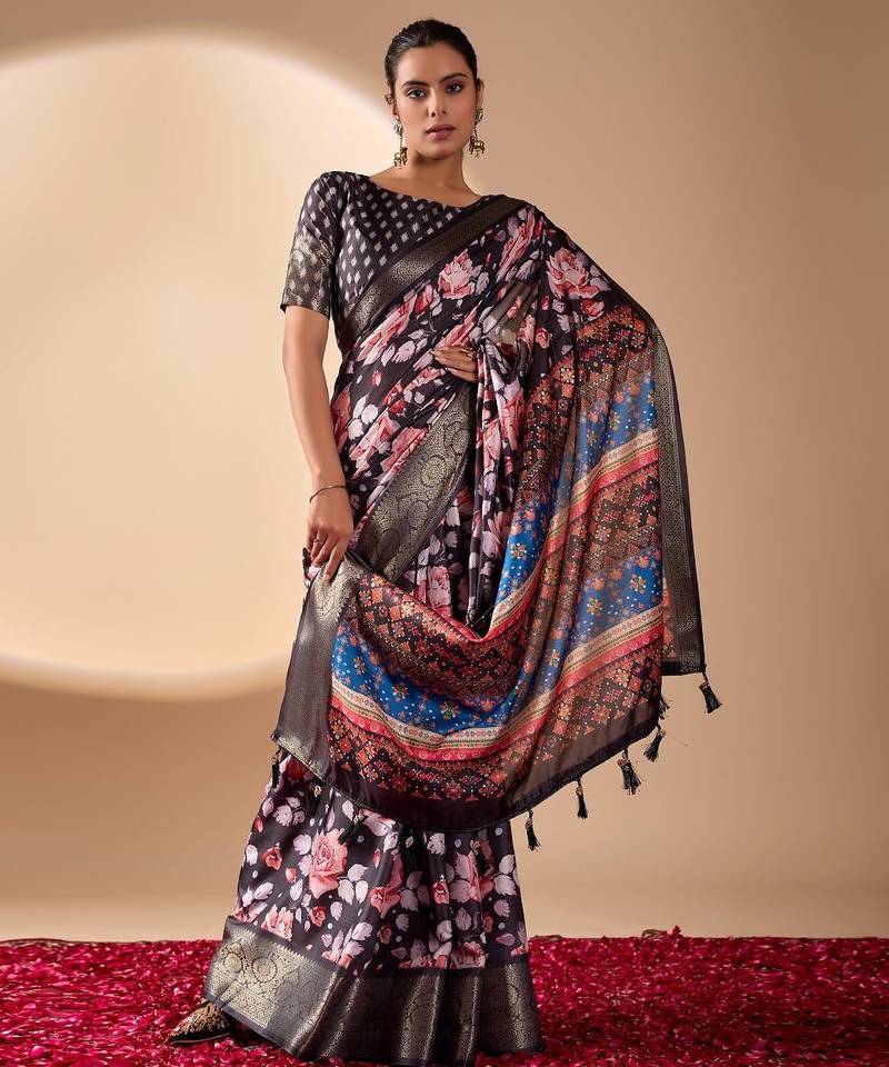 | Product Name | Black Lichi Silk Blend Saree With Floral Prints & Multicolor Traditional Pallu | |
