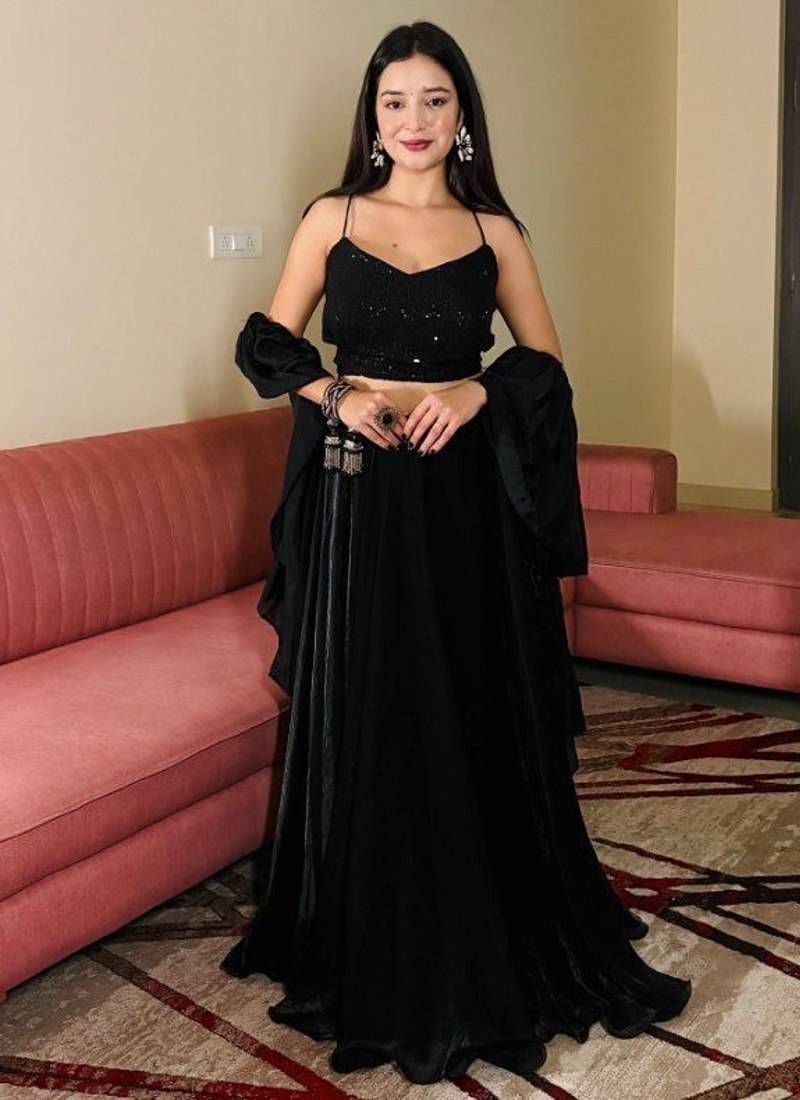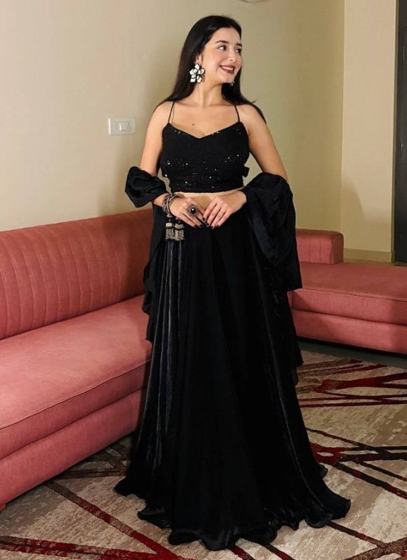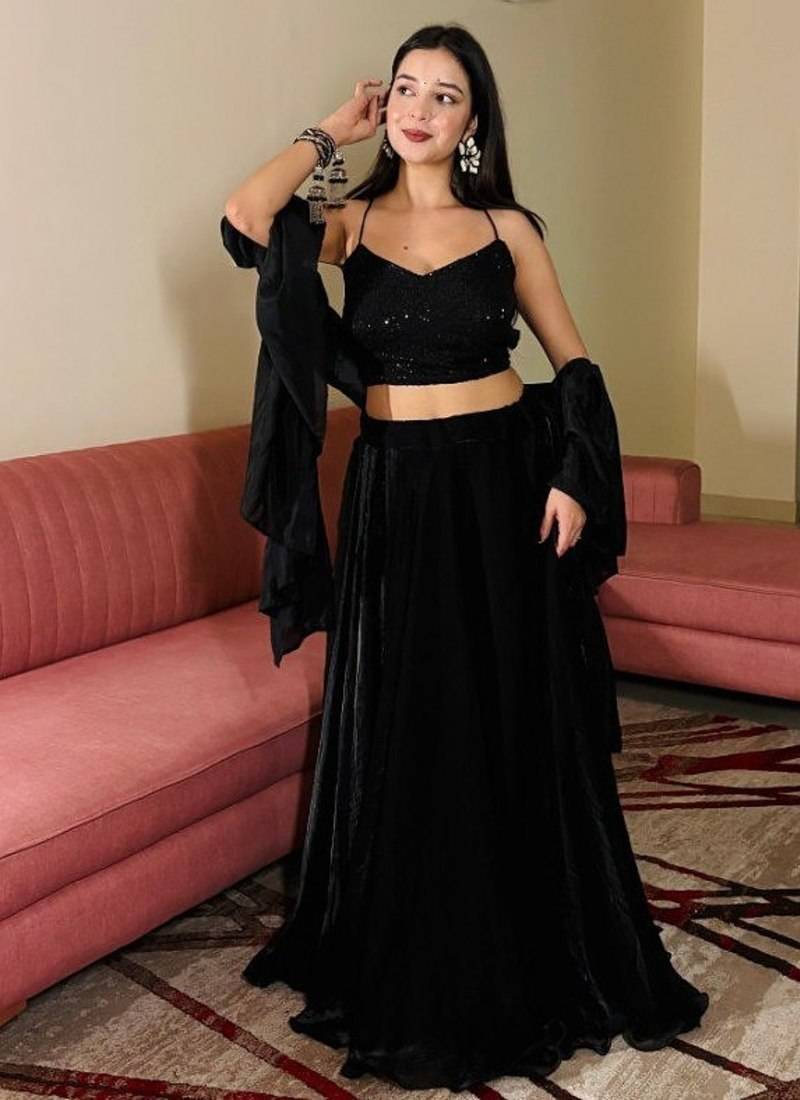 | Product Name | Black Sequin Work Soft Georgette Fendi Crush Lehenga With Chinnon Dupatta,Elegant Partywear Set With Stitched Blouse | |