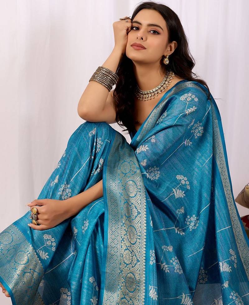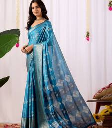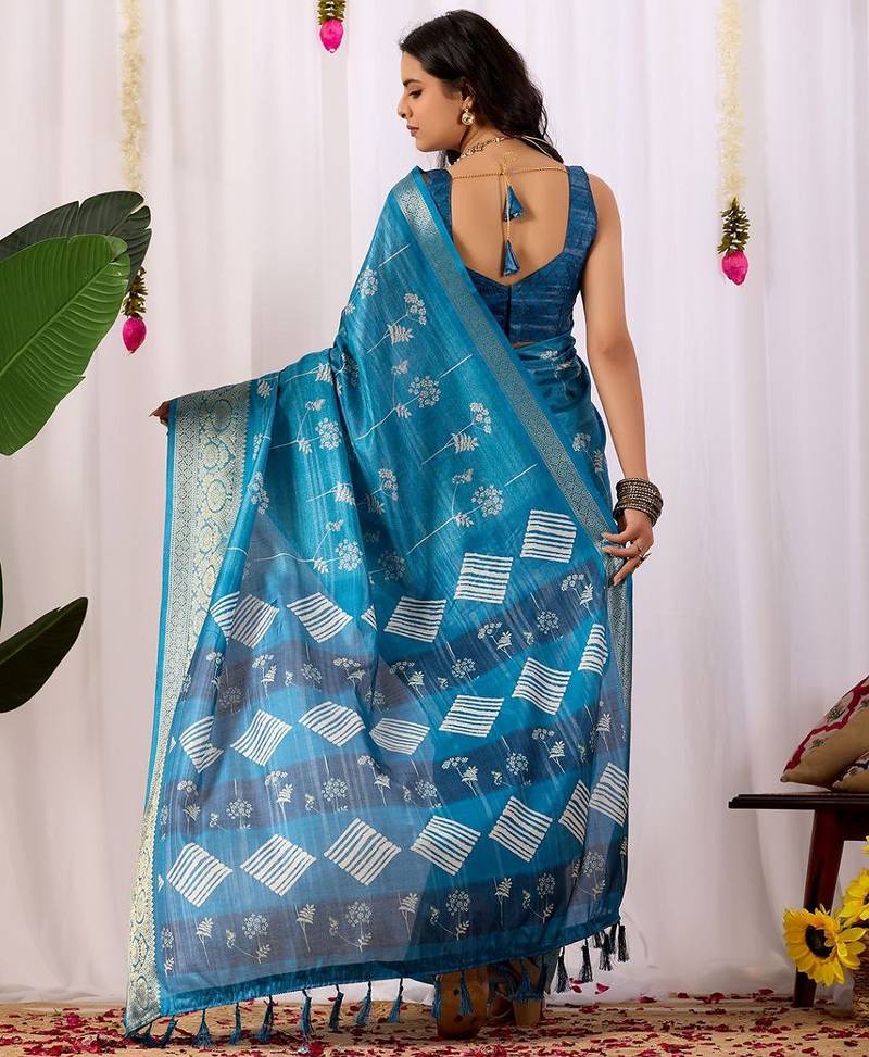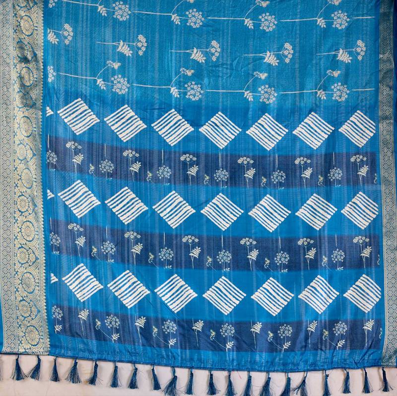 Blue premium lichi silk blend saree with silver zari and ethnic motifs