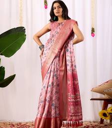 Blush pink lichi silk blend saree with floral digital prints & zari border | matching satin silk blend blouse