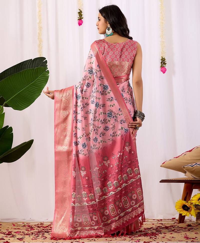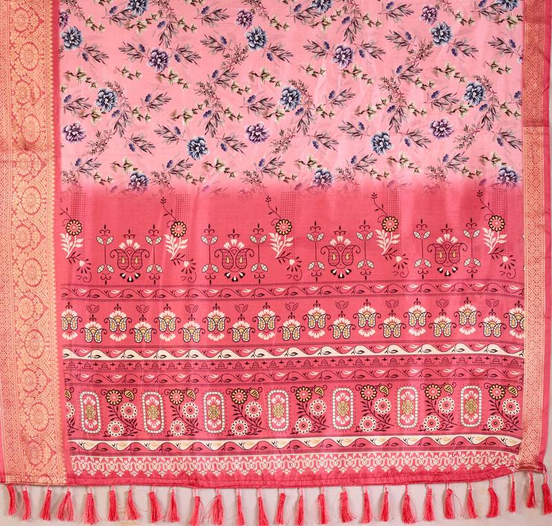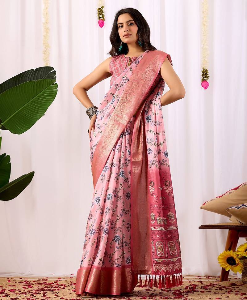 | Product Description | Fabric: Soft Lichi Silk Saree In Blush Pink Tone, Adorned With Delicate All Over Floral Digital Prints And Complemented By A Rich Woven Zari Border & Pallu — A Perfect Fusion Of Modern Grace And Traditional Charm. Blouse: Matching Satin Silk Printed Blouse (0.80 Mtr) |