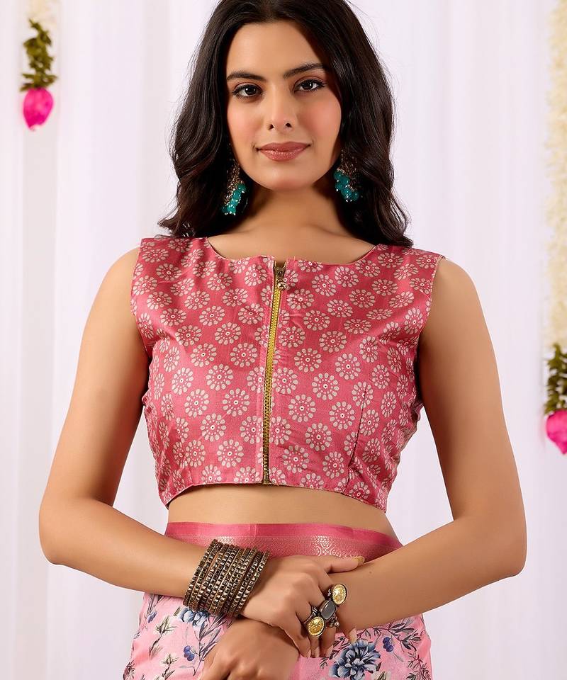| Product Name | Blush Pink Lichi Silk Blend Saree With Floral Digital Prints & Zari Border | Matching Satin Silk Blend Blouse | |