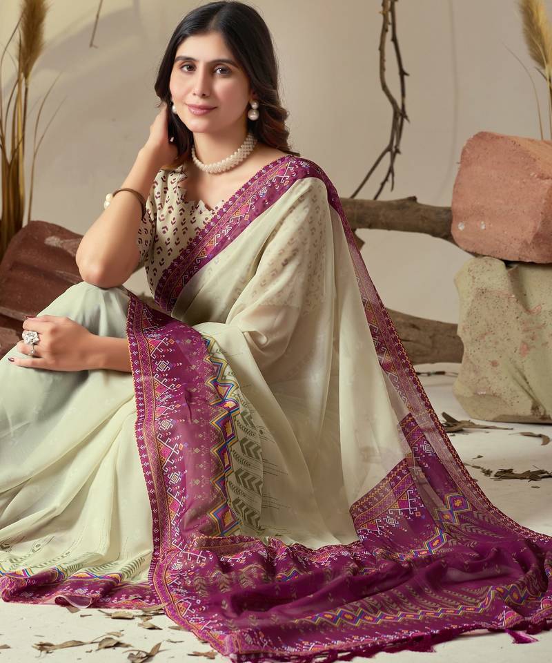 | Product Name | Cream Georgette Saree With Pink Geometric Print Border & Tassel Detailing With Blouse | |