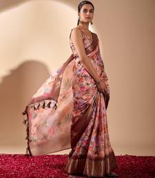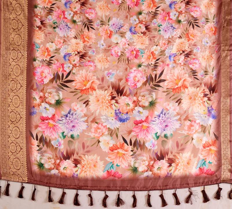 Elegant soft lichi silk saree with digital floral print and golden zari border – vintage charm