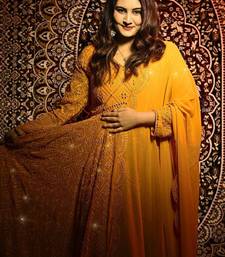 Faux blooming mustard yellow kali cut suit with sequins thread embroidery, stitched pants & dupatta set