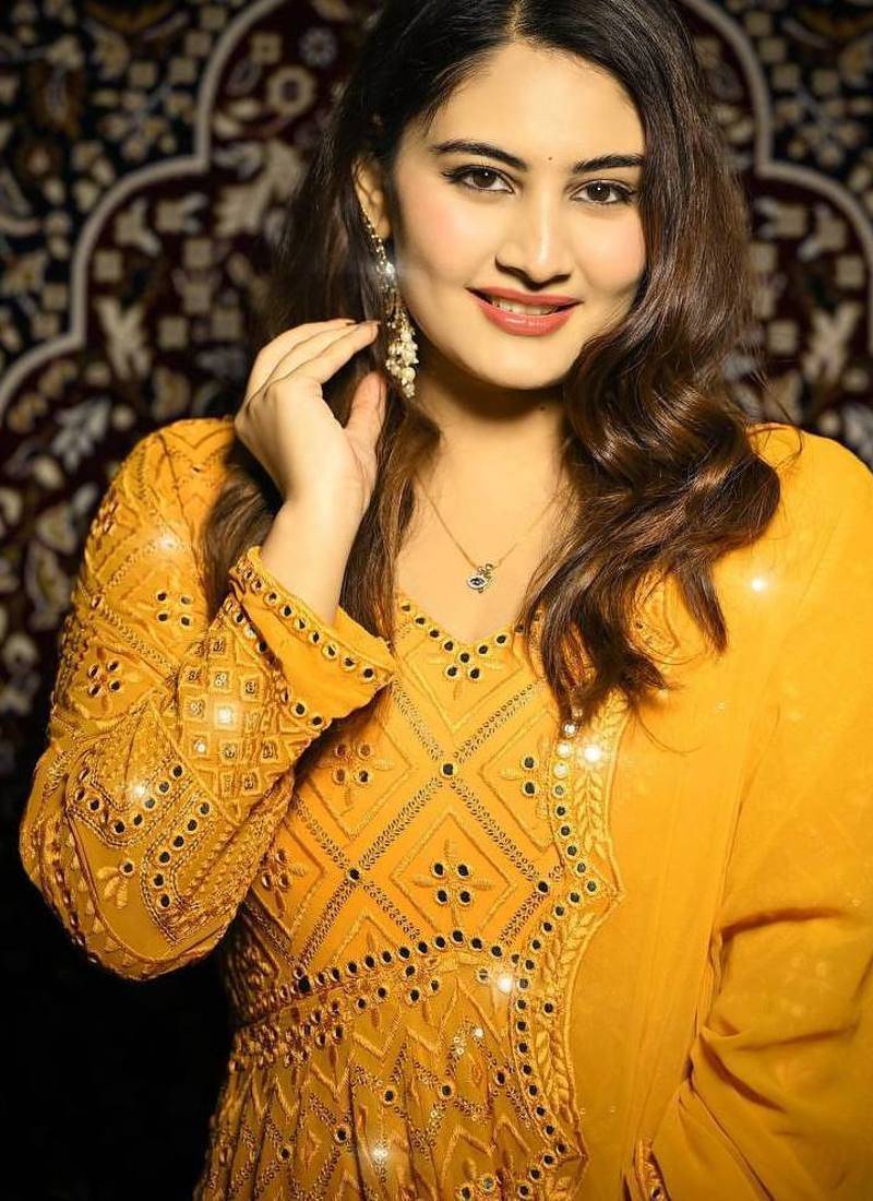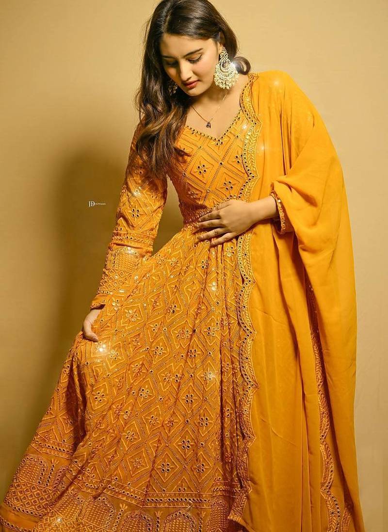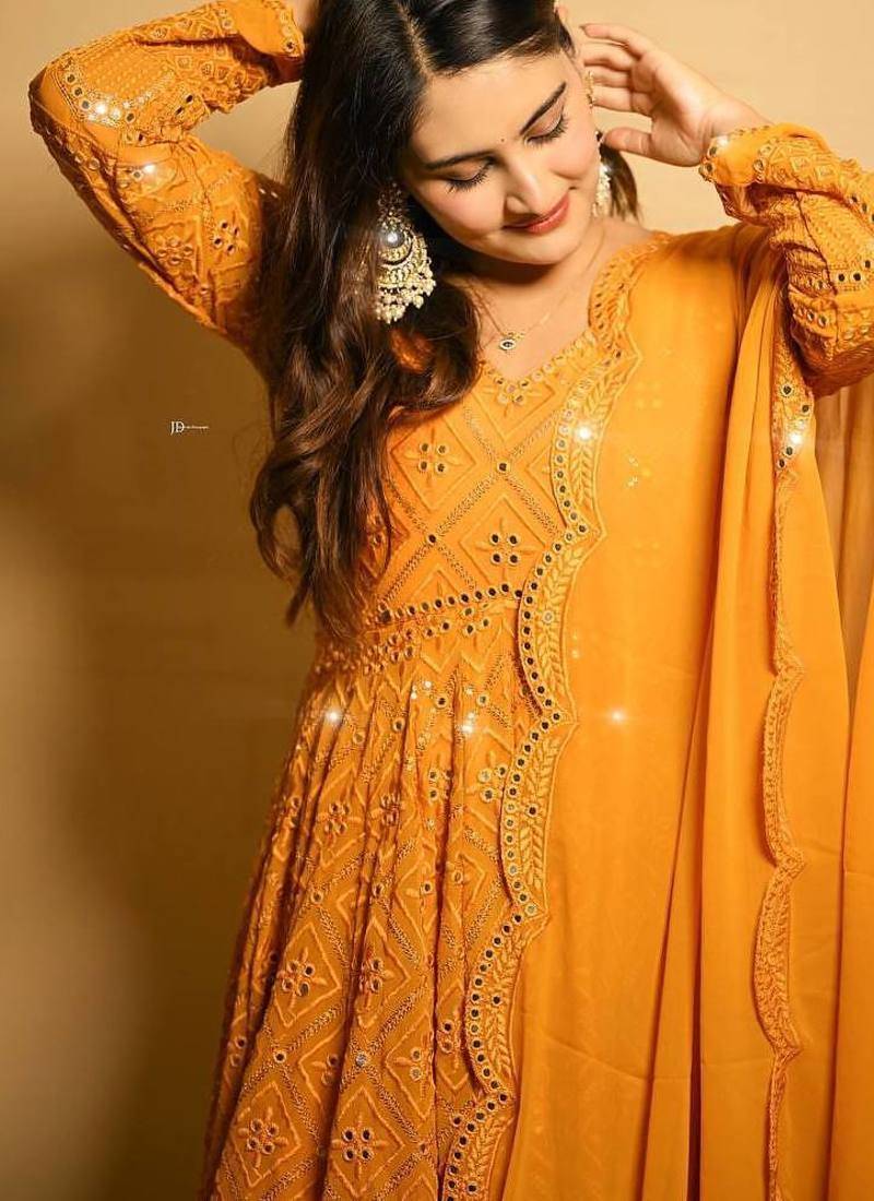 Product Name | Faux Blooming Mustard Yellow Kali Cut Suit With Sequins Thread Embroidery, Stitched Pants & Dupatta Set | |