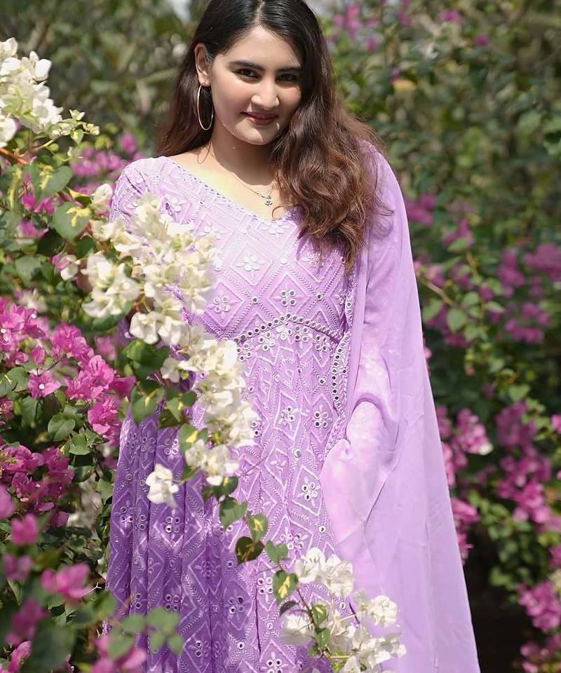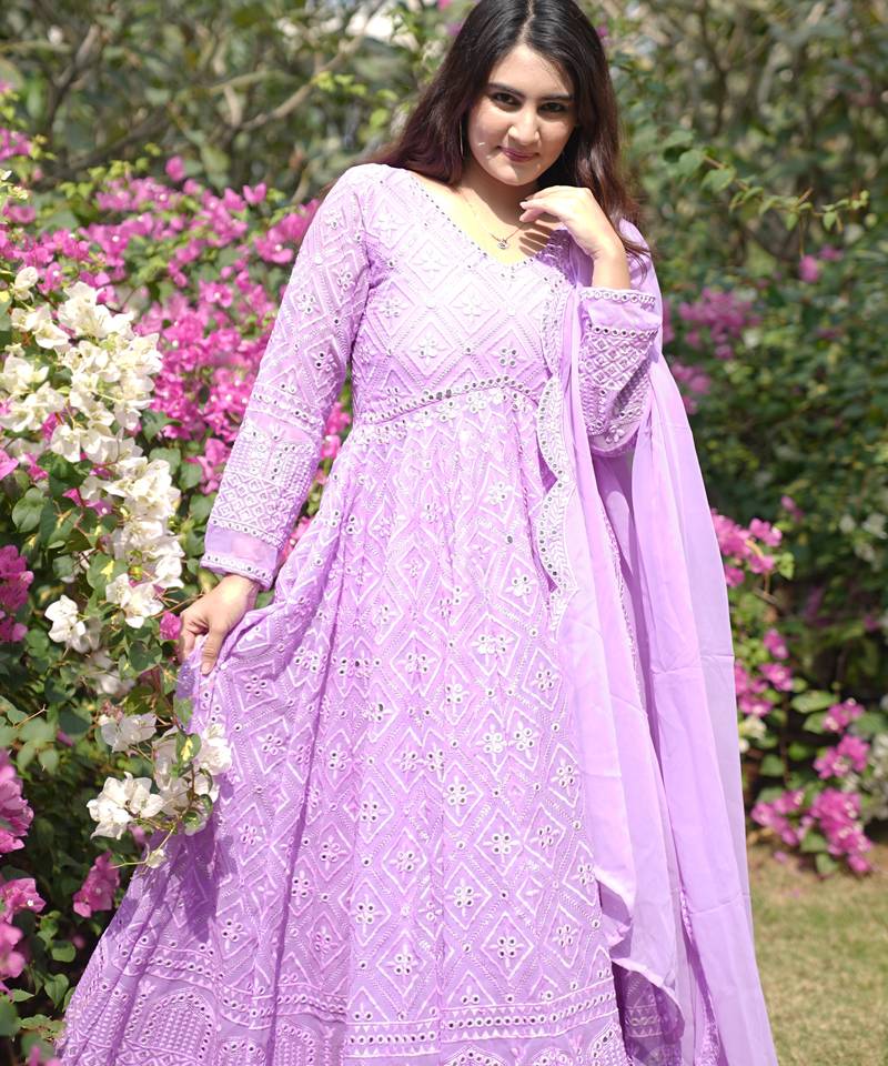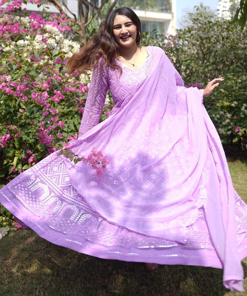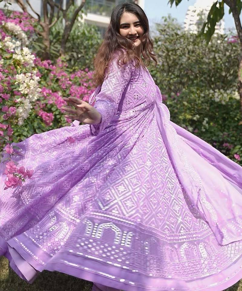 Faux blooming purple kali cut suit with sequins thread embroidery, stitched pants & dupatta set