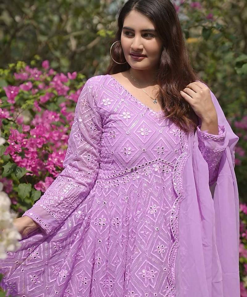 Product Name | Faux Blooming Purple Kali Cut Suit With Sequins Thread Embroidery, Stitched Pants & Dupatta Set | |
