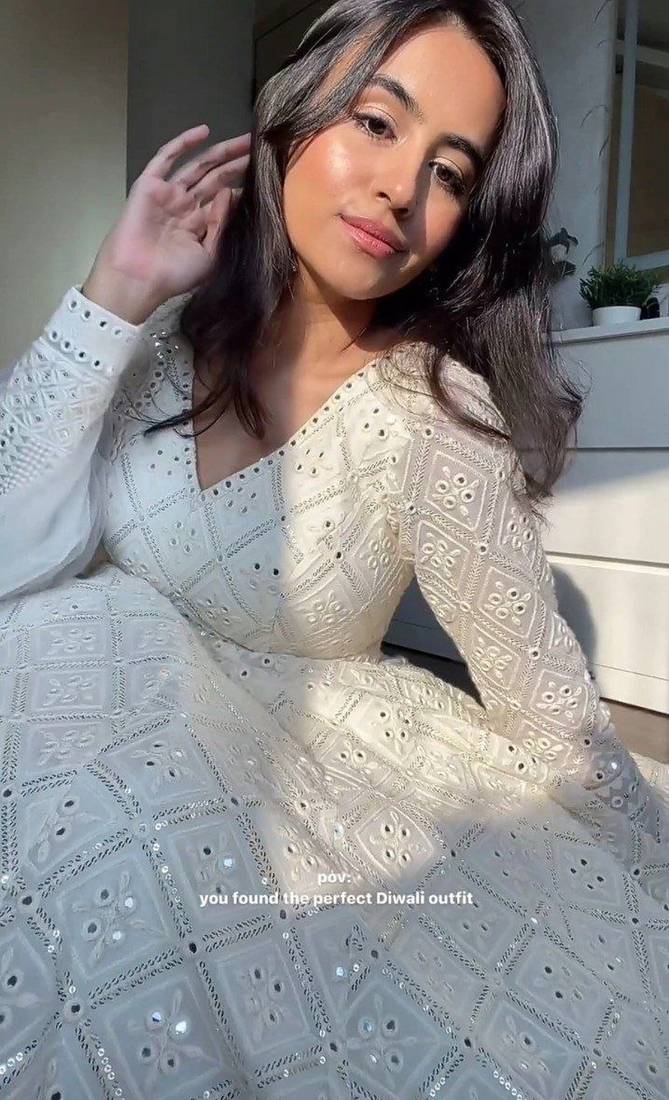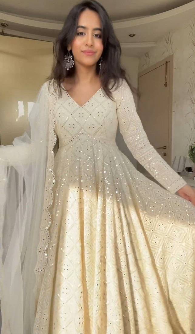 Product Name | Faux Blooming White Kali Cut Suit With Sequins Thread Embroidery, Stitched Pants & Dupatta Set | |