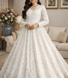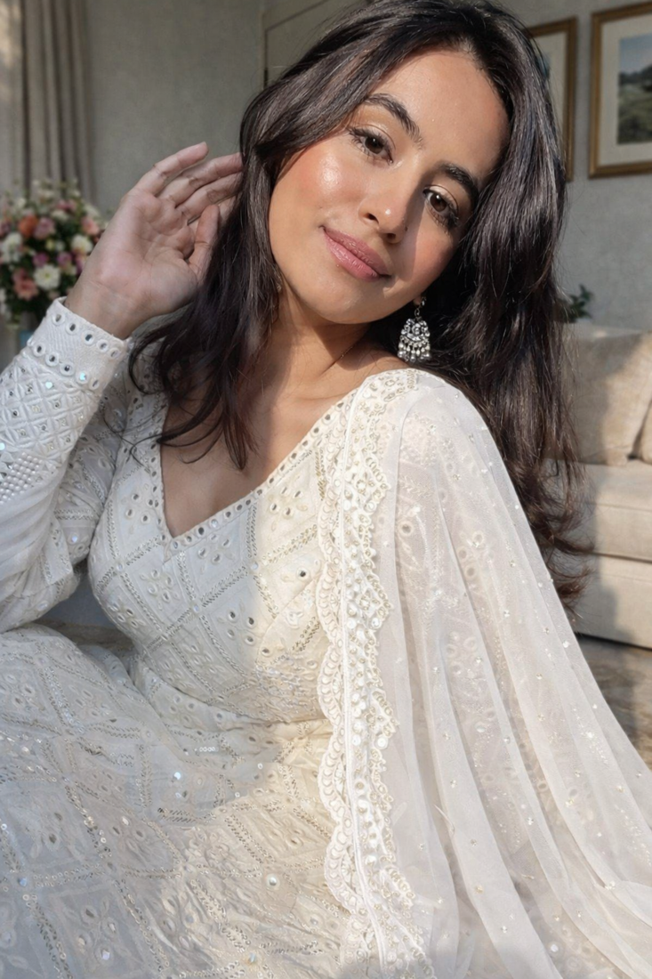 | Product Name | Faux Blooming White Kali Cut Suit With Sequins Thread Embroidery, Stitched Pants & Dupatta Set | |